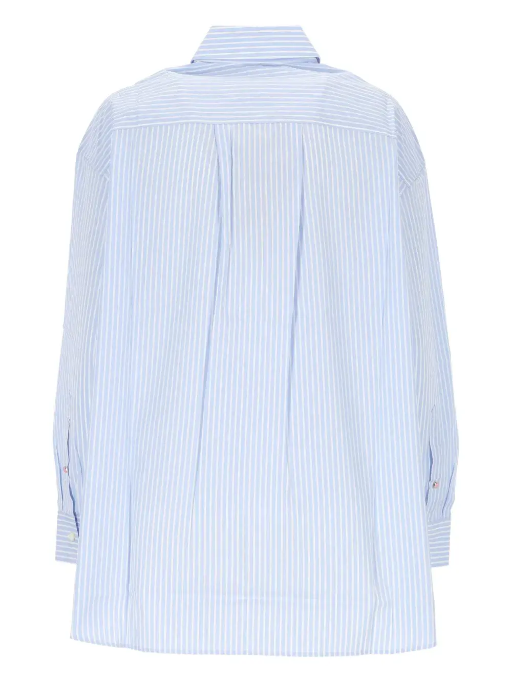 Синий и белый вертикальный полосатый узор, застёжка на пуговицы, накладной карман на груди, классический воротник, длинные рукава