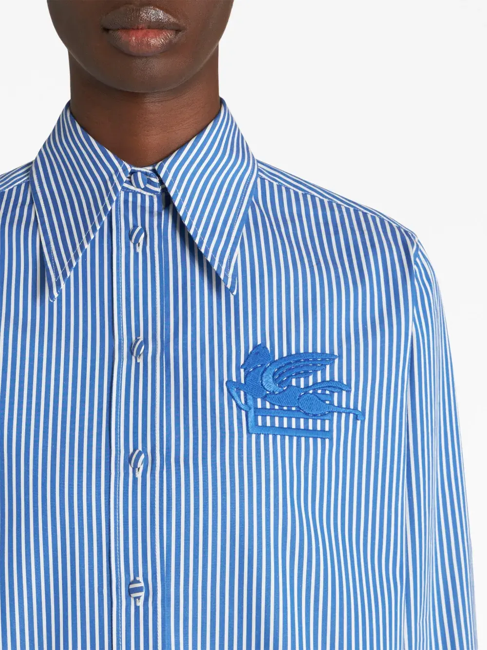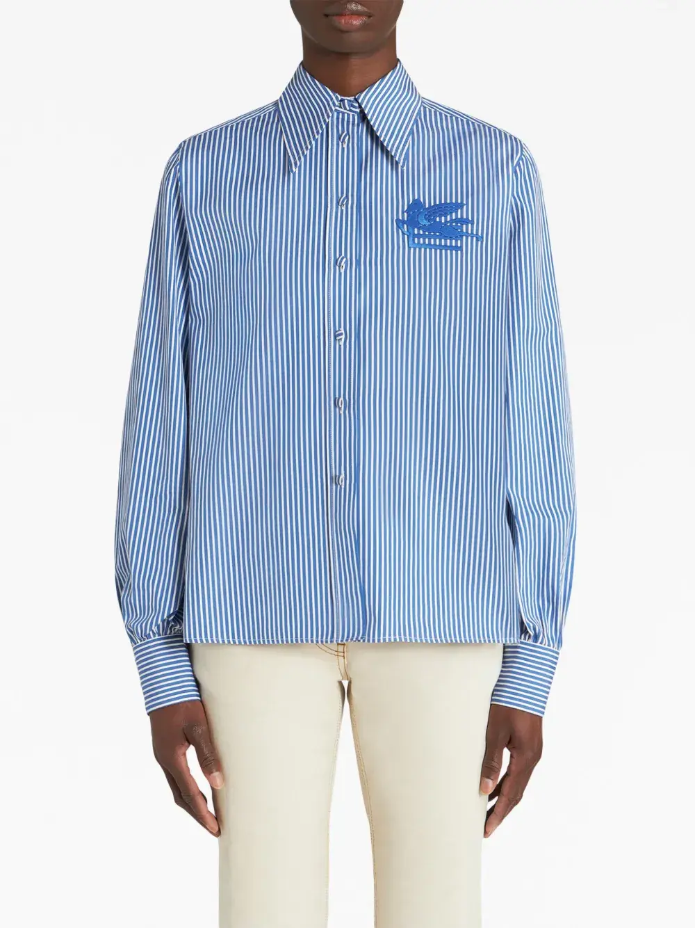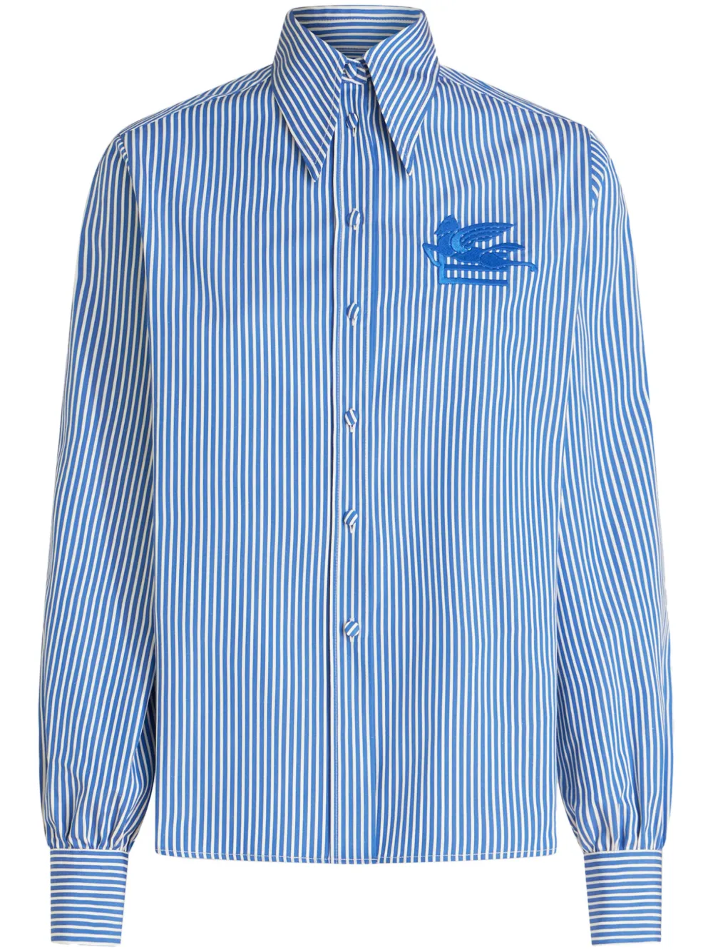 Голубой, белый, хлопок, узор в полоску, вышитый логотип, плоский заостренный воротник, застежка на пуговицах спереди, длинные рукава, манжеты на пуговицах и прямой подол.