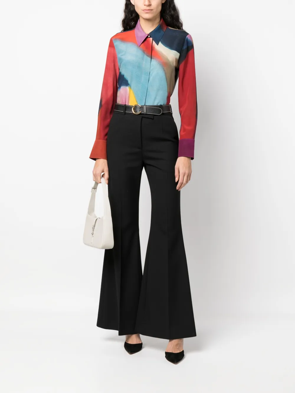 Разноцветный, шелк, абстрактный принт, потайная пуговичная застежка спереди, классический воротник, длинные рукава, манжеты на пуговицах и закругленный подол.