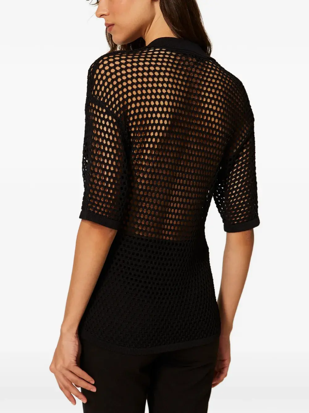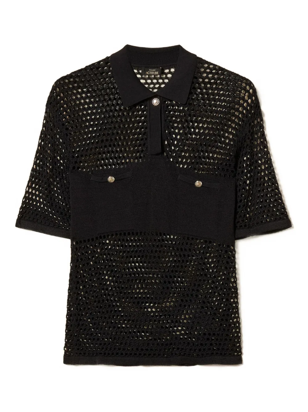 Черное поло с воротником, нагрудным карманом, короткими рукавами и застежкой на пуговицы