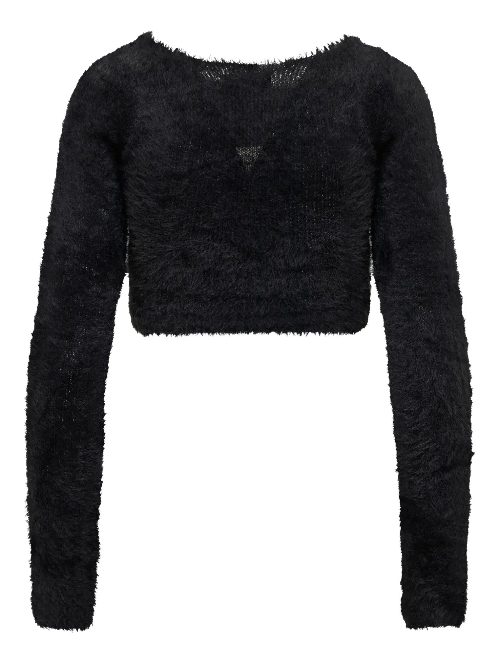 Черный, трикотажный материал, фактурная отделка, U-образный вырез, длинные рукава, прямой подол и укороченная длина.