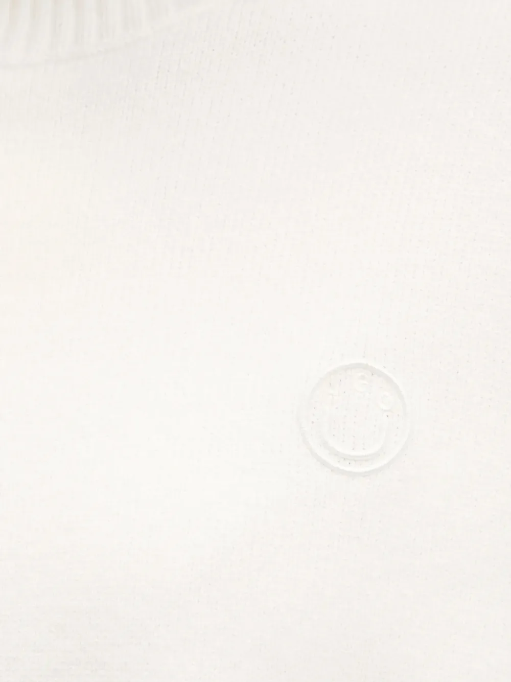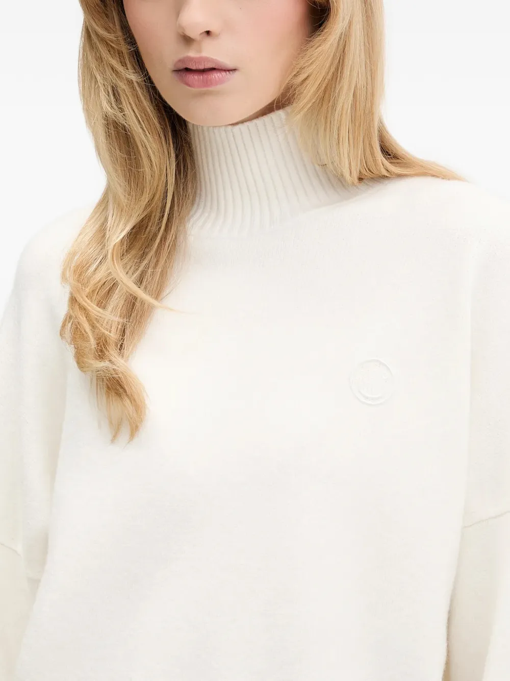 Белый свитер с воротником-стойкой, длинными рукавами, рубчатым подолом и манжетами