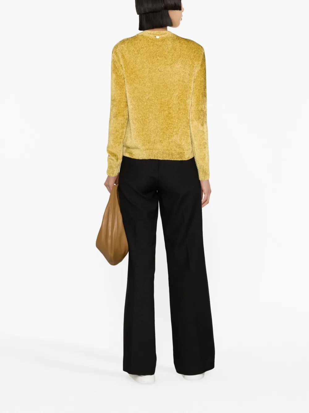 Горчично-желтый, материал с шениловой текстурой, отделка в рубчик, круглый вырез, длинные рукава и прямой подол.