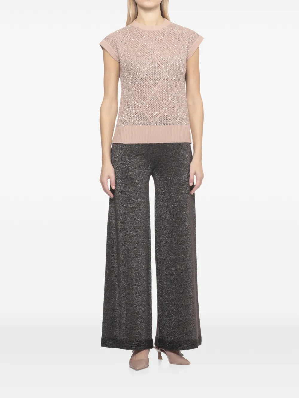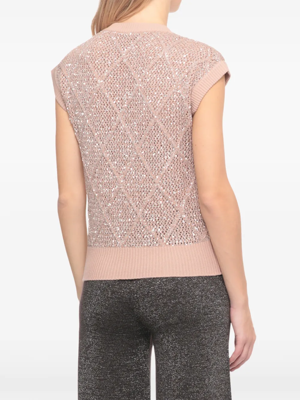 Бежевый безрукавный джемпер из шерстяной смеси с пайетками, круглым вырезом и ребристыми краями