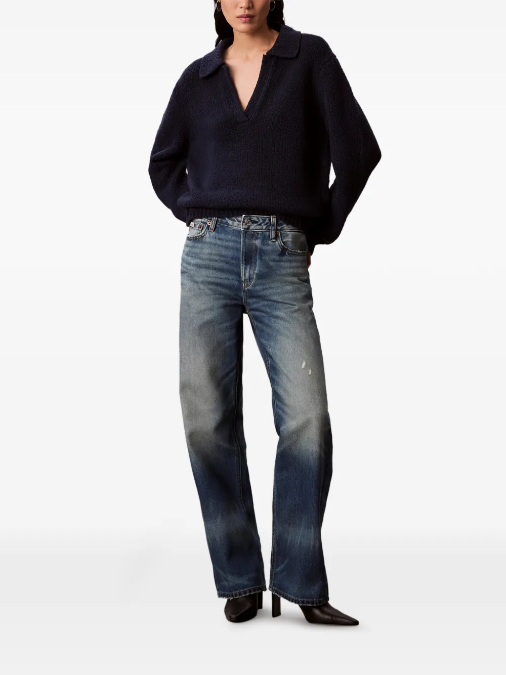 Тёмно-синий трикотаж из букле с V-образным вырезом и длинными рукавами
