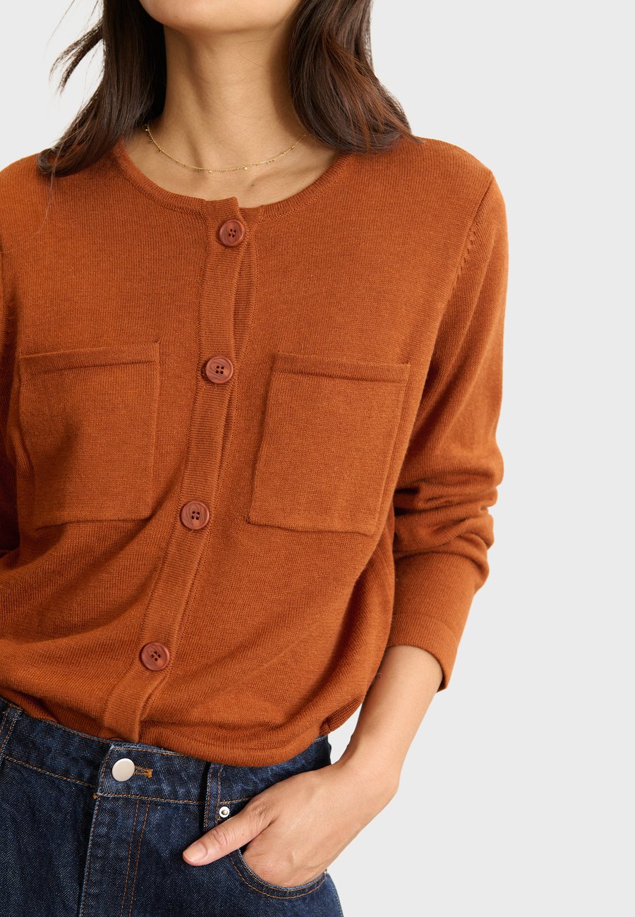 Кардиган с длинными рукавами, круглым вырезом, двумя нагрудными карманами и застежкой на пуговицы. Изделие, сочетающее в себе практичность и элегантность, идеально подходит как для изысканных, так и для повседневных образов. Вырез: КруглыйМатериал и уход