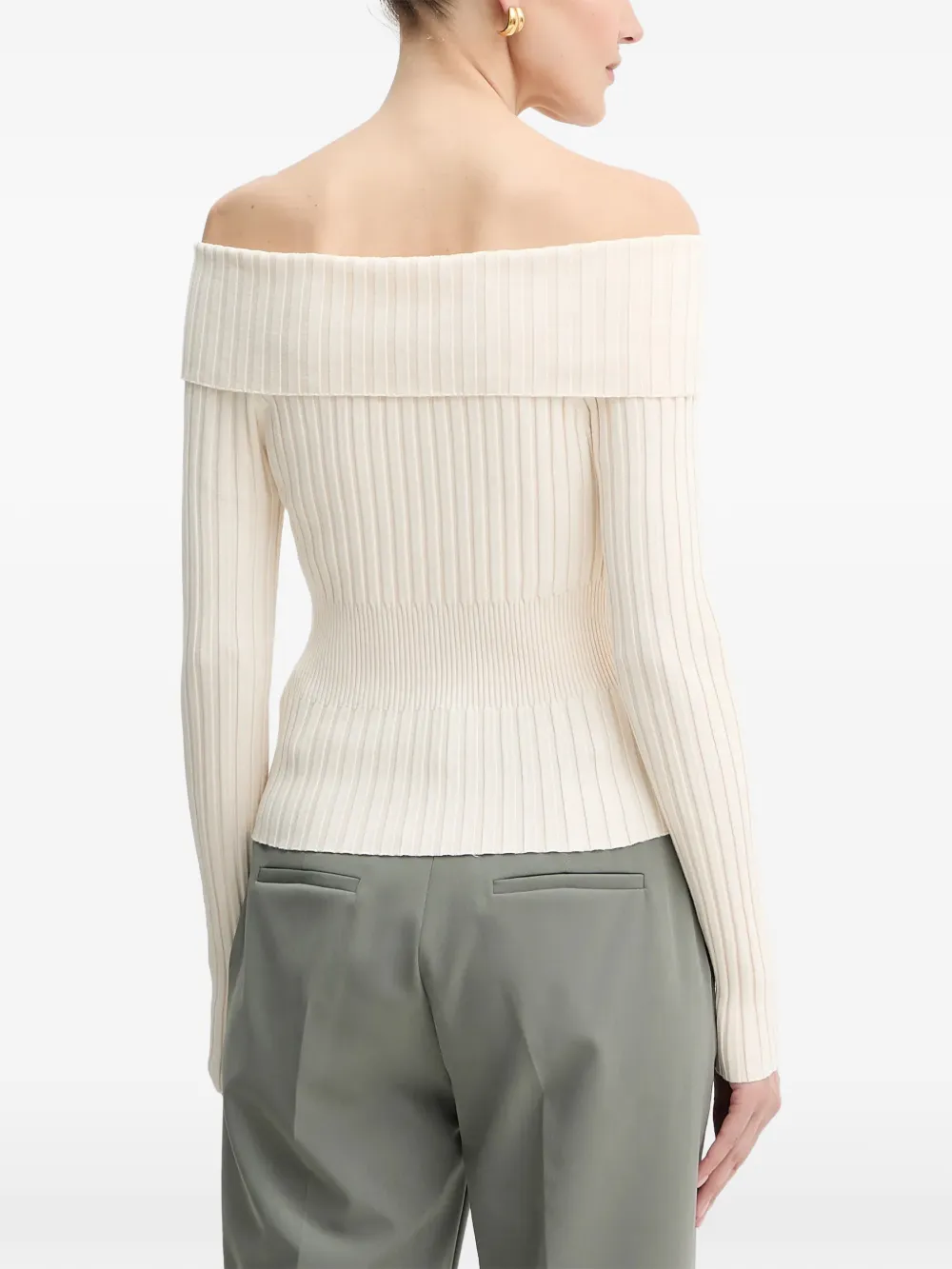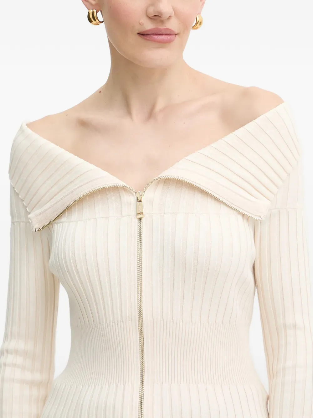 Белый вязаный топ в рубчик с открытыми плечами, длинными рукавами и застежкой-молнией