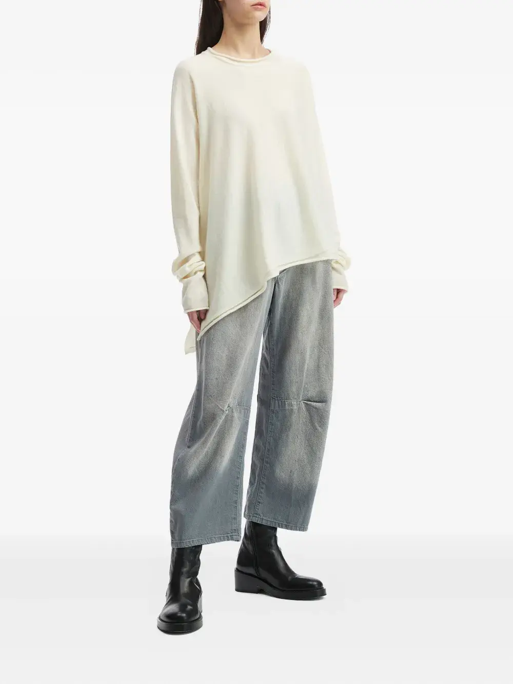 Шерстяной свитер цвета кремовый с асимметричным подолом, круглым вырезом, длинными рукавами и необработанными краями