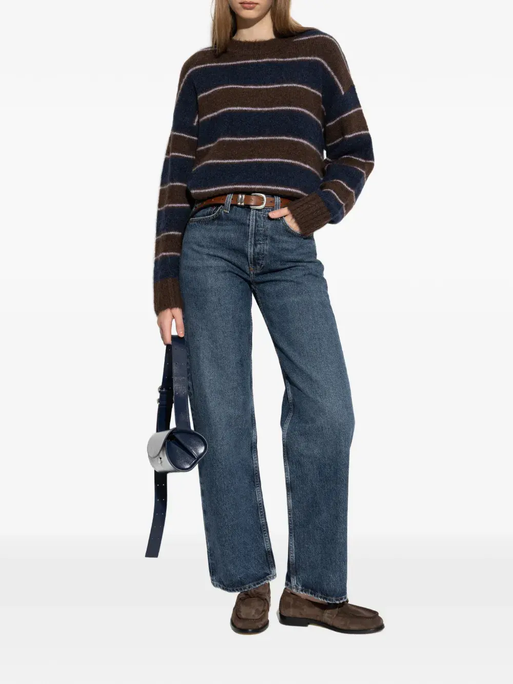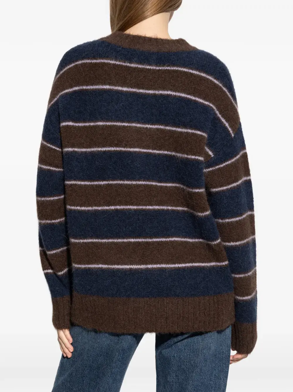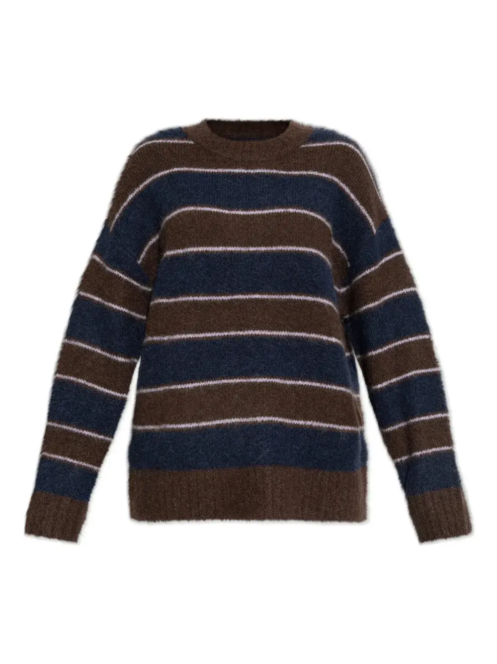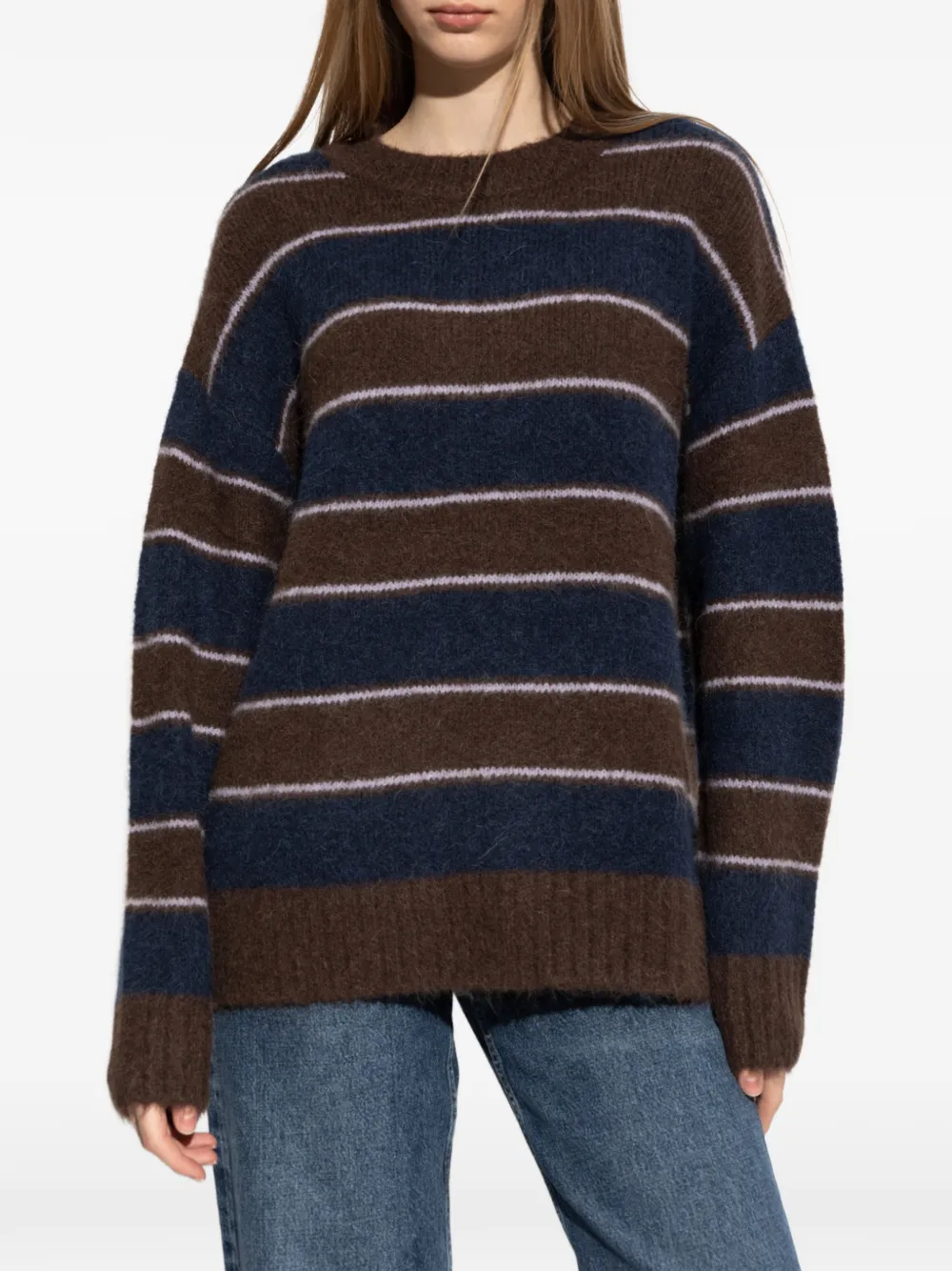 Синий и коричневый полосатый дизайн, круглый вырез, длинные рукава, ребристые манжеты, ребристый край
