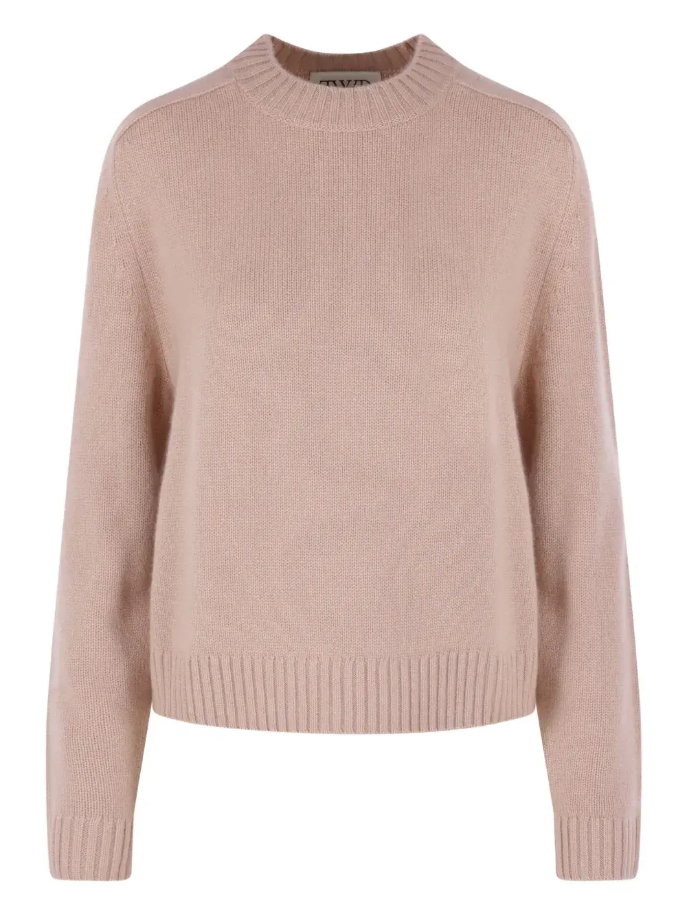 Нейтральный кашемировый свитер с круглым вырезом, длинными рукавами и ребристыми краями