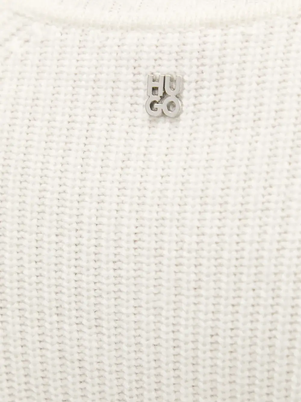 Белый вязаный топ в рубчик с логотипом на планке, с воротником-стойкой и длинными рукавами