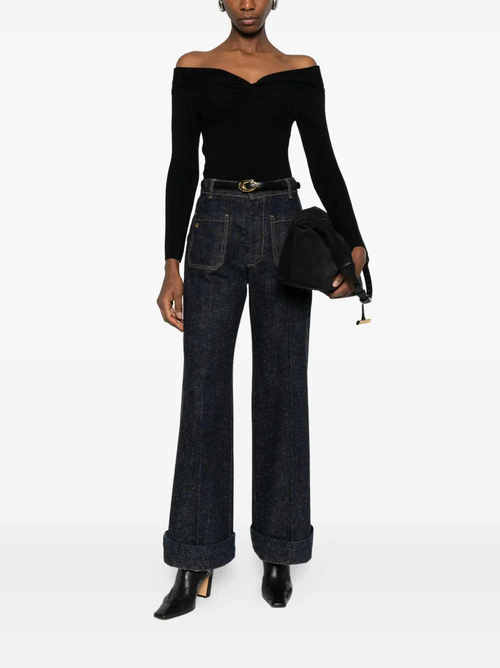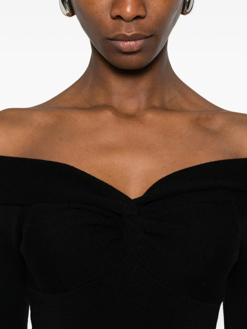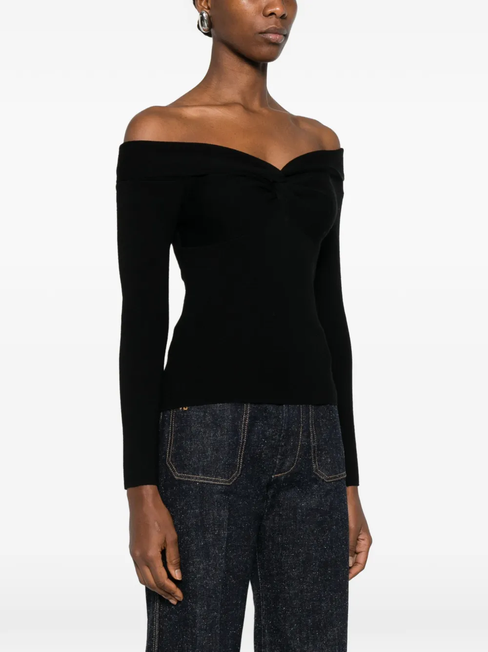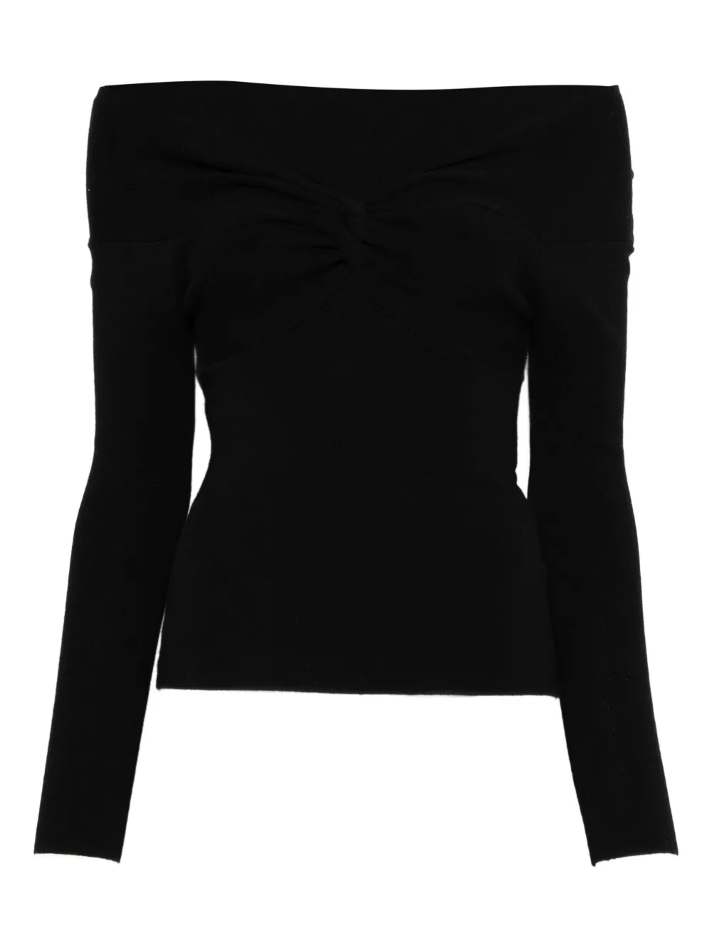 Чёрный трикотажный топ с открытыми плечами, длинными рукавами, перекрученной деталью и ребристой вязкой