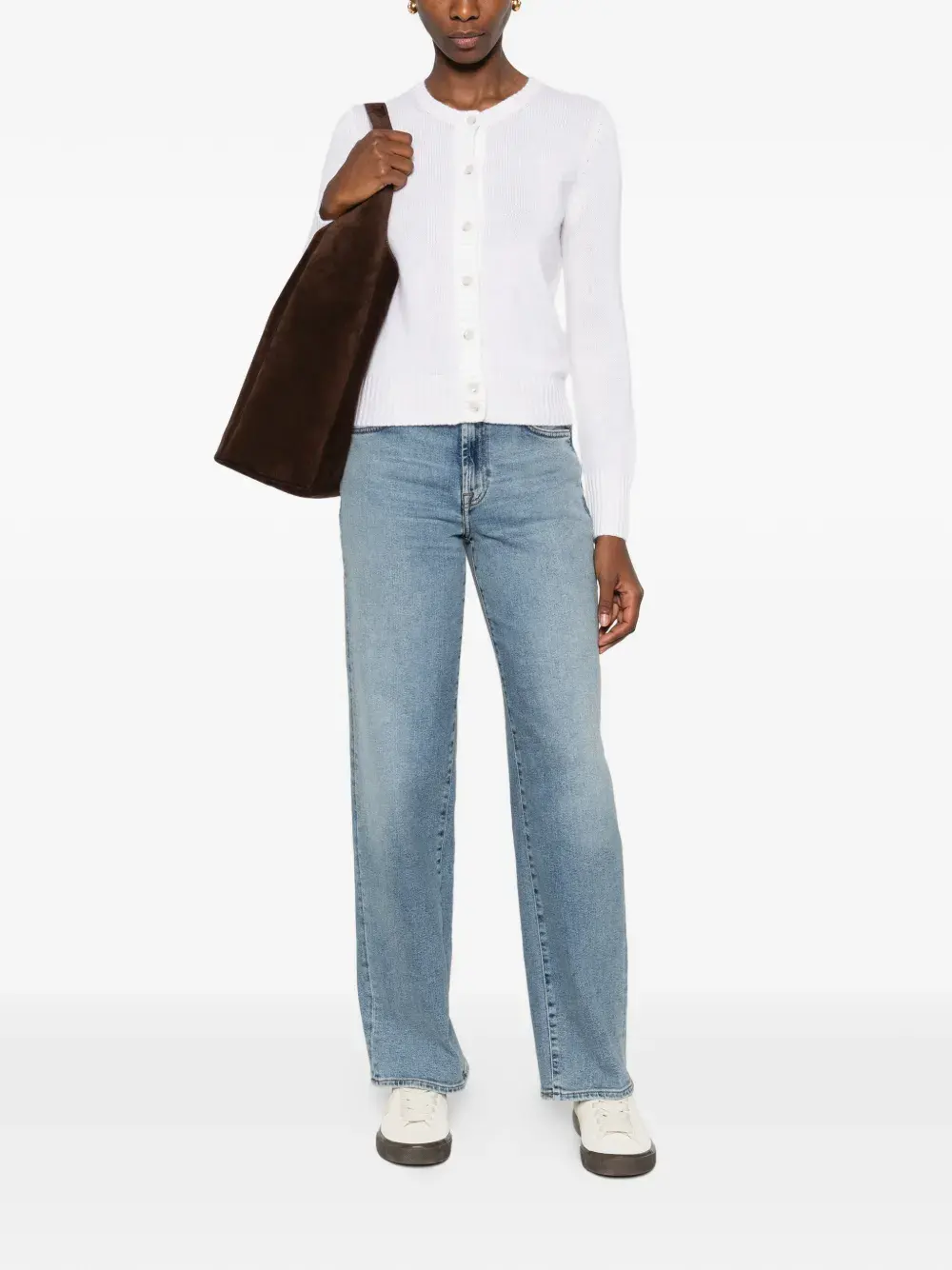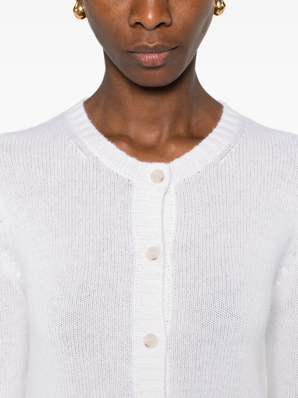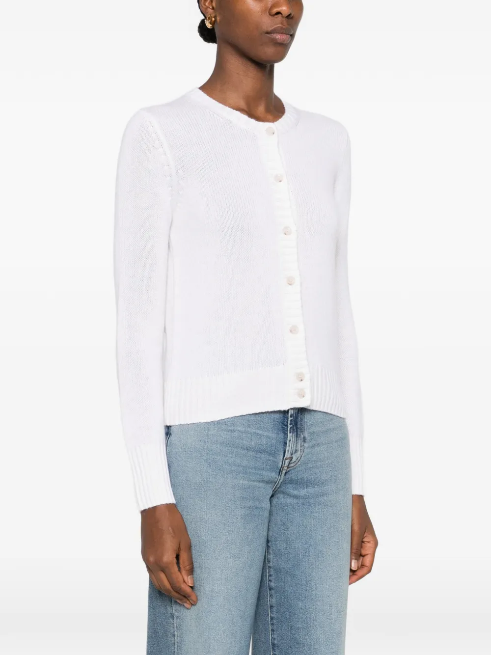 Молочно-белый цвет, застёжка на пуговицы, длинные рукава, круглый вырез, ребристые края
