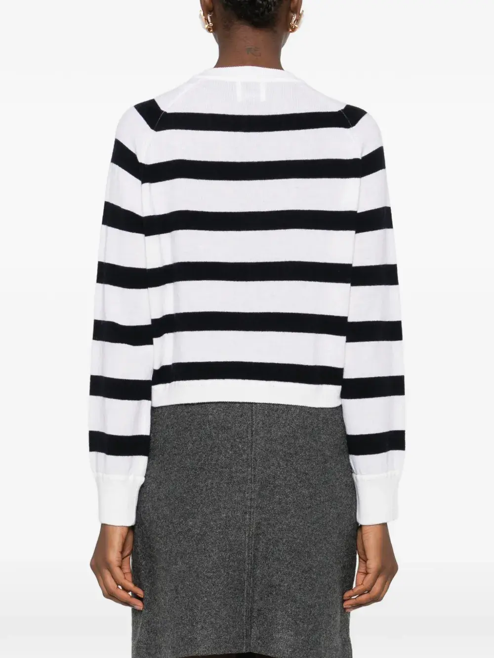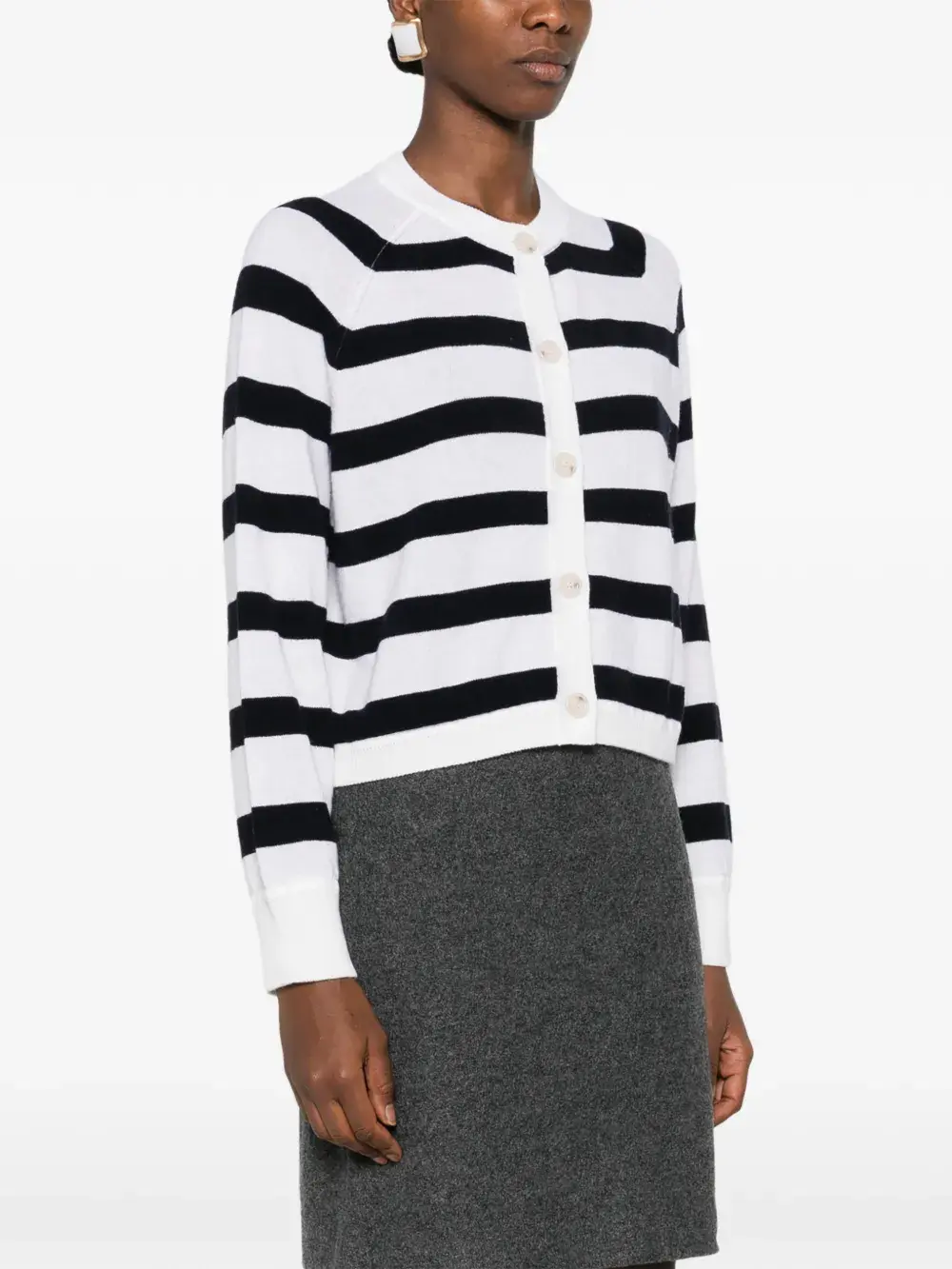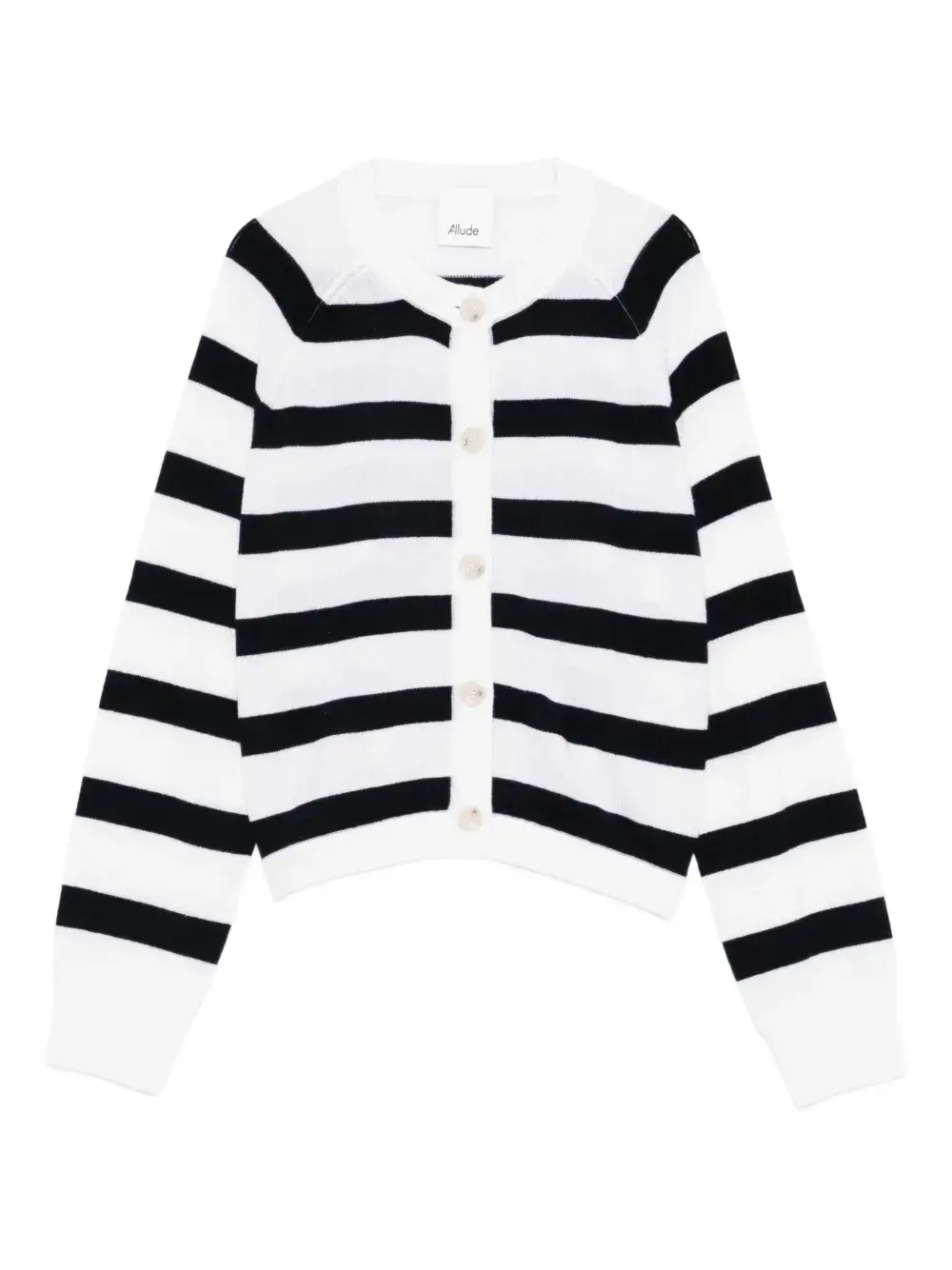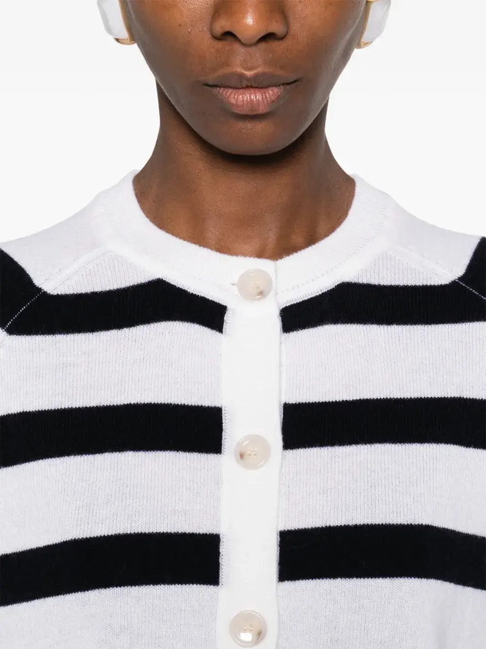 Белый и чёрный полосатый узор, застёжка на пуговицы, круглый вырез, длинные рукава