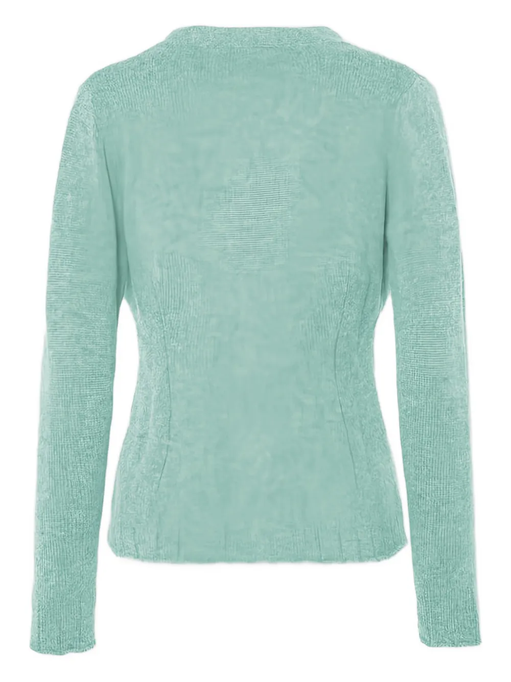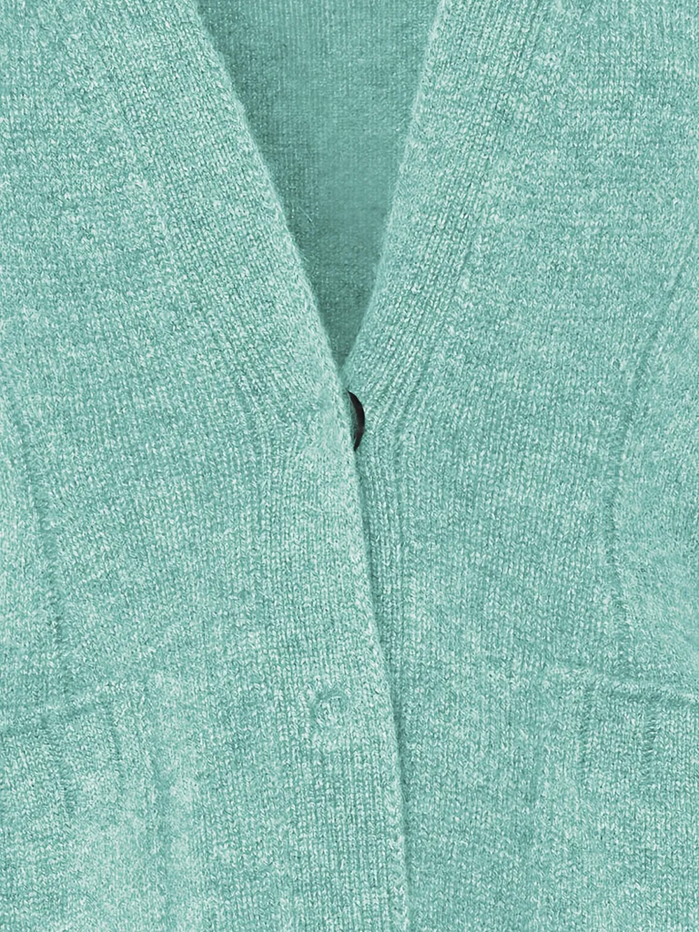 Светло-шалфейный цвет, V-образный вырез, застежка на пуговицы, длинные рукава, передние карманы