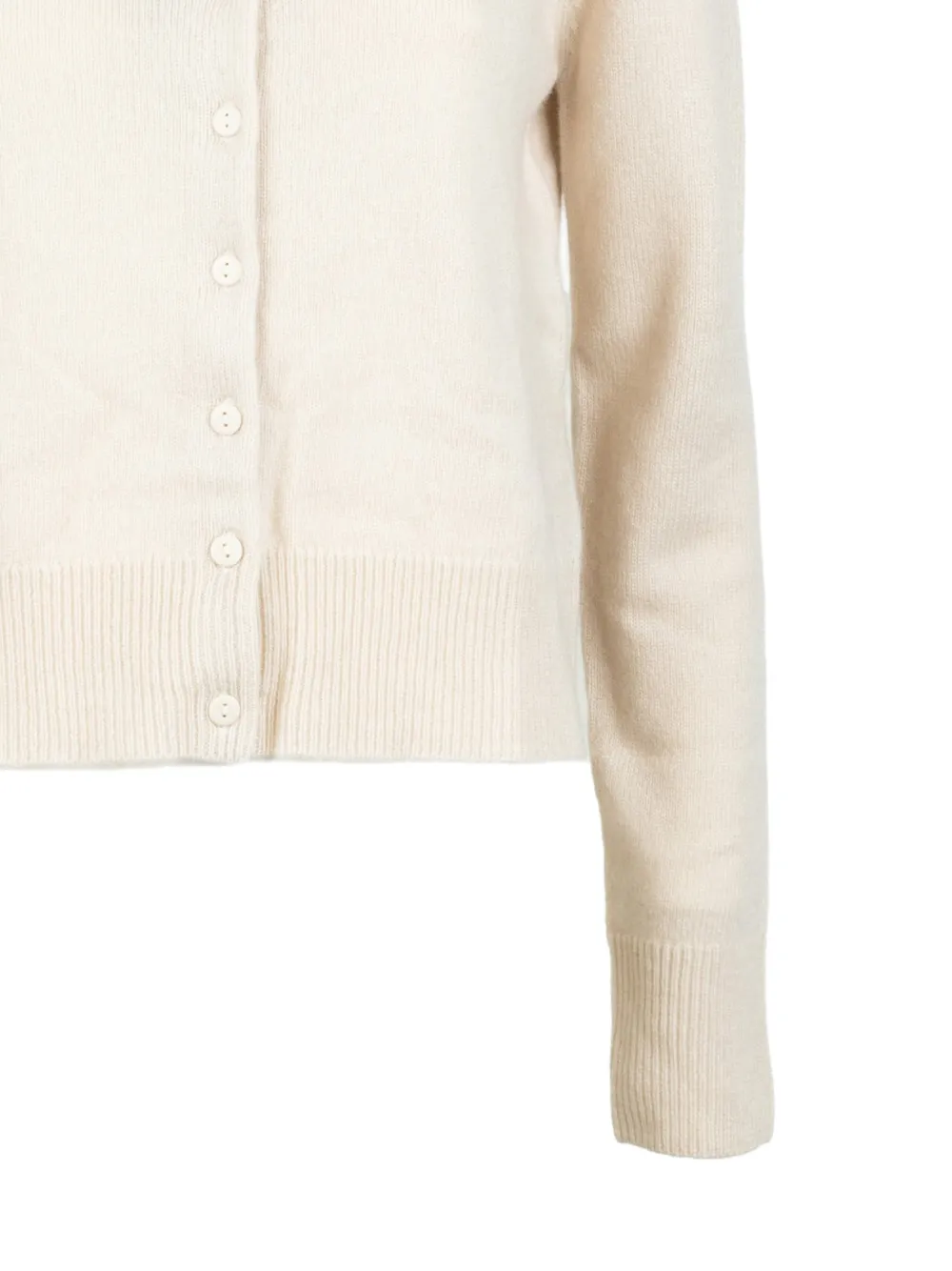 Слоновая кость, застежка на пуговицы спереди, круглый вырез, манжеты в рубчик, нижний край в рубчик
