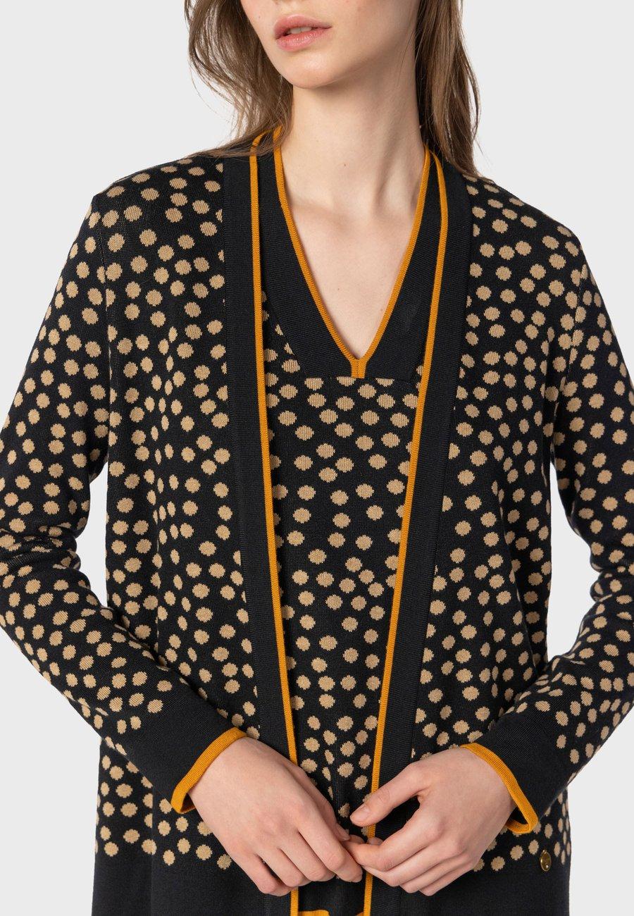 Жаккардовый трикотажный жакет с игривым узором в горошек и изысканной контрастной отделкой. Открытый перед, обеспечивающий расслабленный и универсальный образ. Страна происхождения: Испания. Застежка: без застежки.Материал и уход