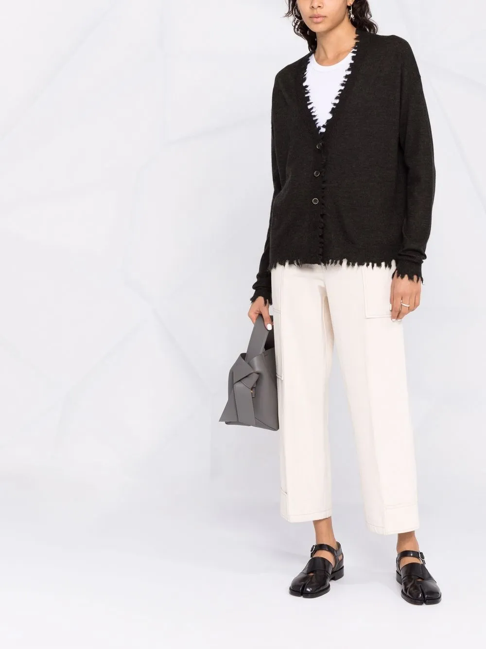 Необработанные края, V-образный вырез, застежка на пуговицах спереди, длинные рукава и прямой подол.
