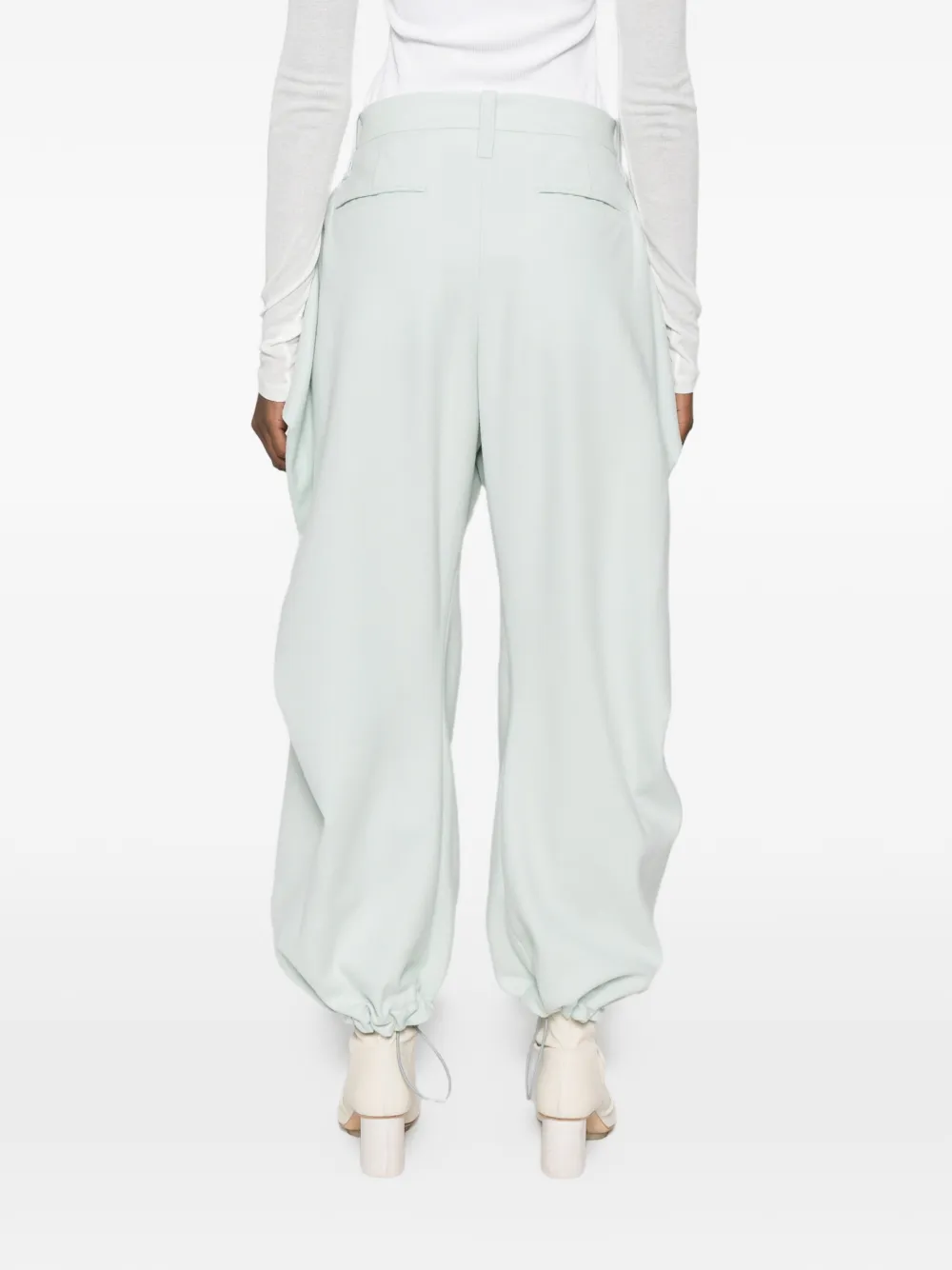 Бледно-голубая твидовая текстура, застежка на пуговицы спереди, драпировка, широкие брючины, шлевки для ремня