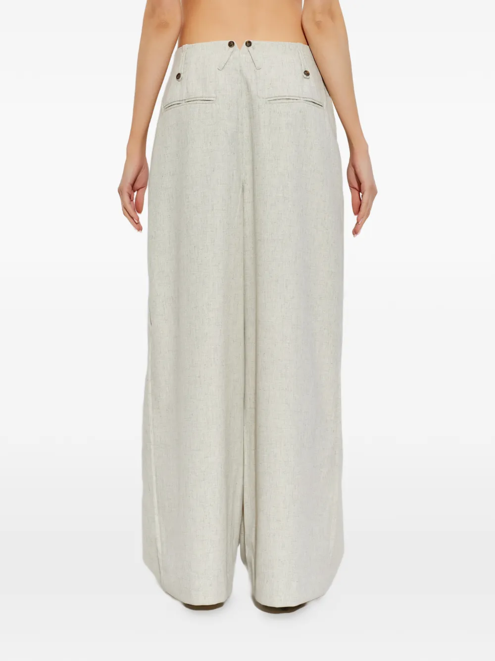 Светло-серый цвет, застежка на пуговицы, плиссировка, шлевки для ремня, задние карманы, скрытая застежка