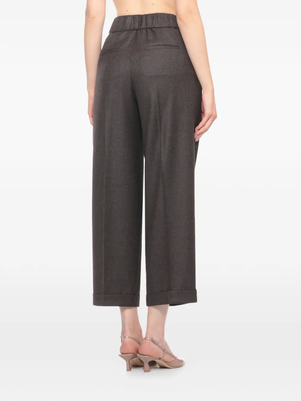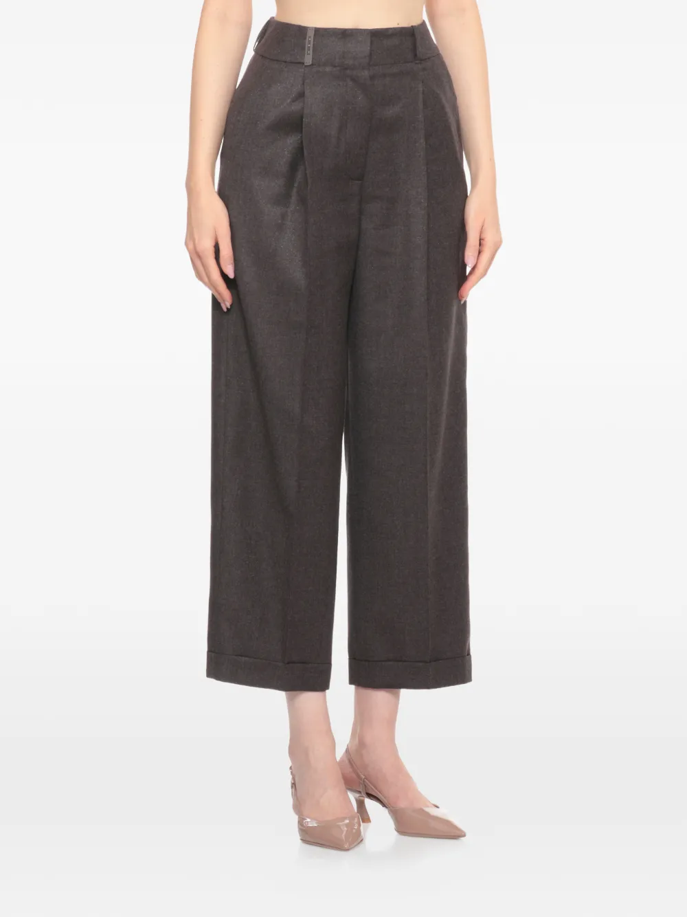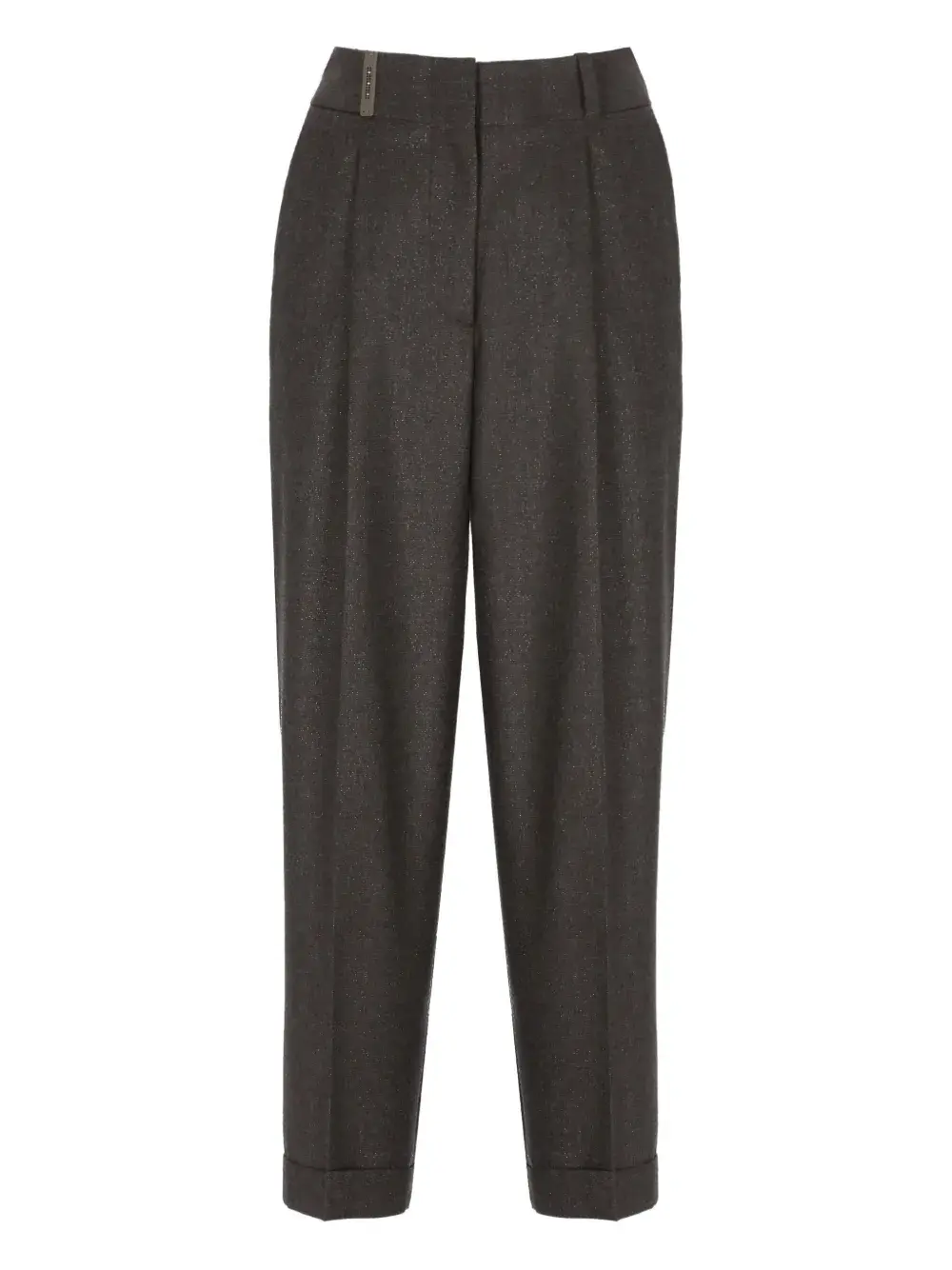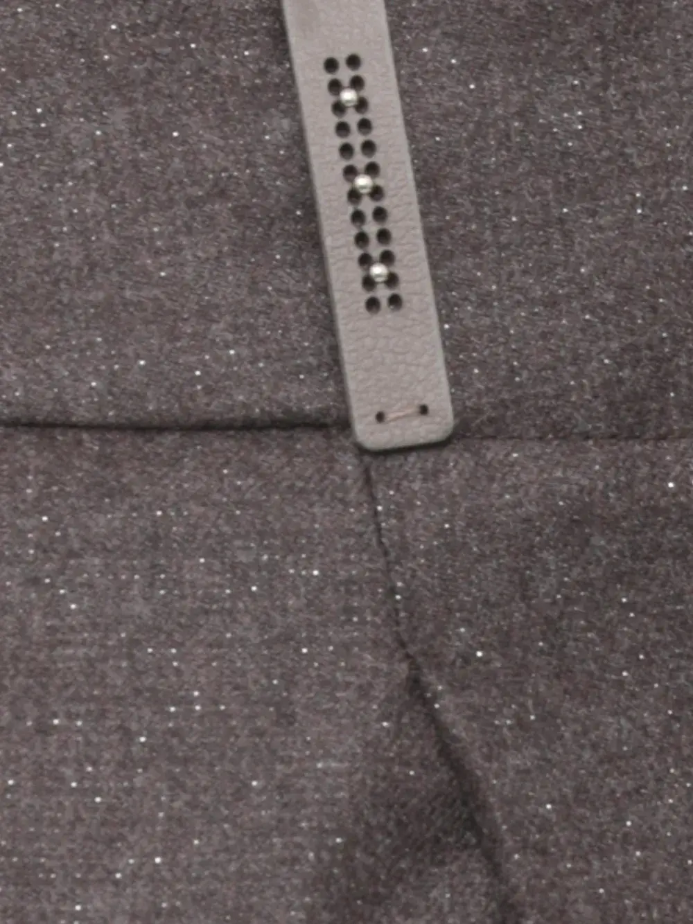 Коричневый цвет с блестящими деталями, шлёвки для ремня, манжеты с отворотом, защипы спереди, застёжка на пуговицу