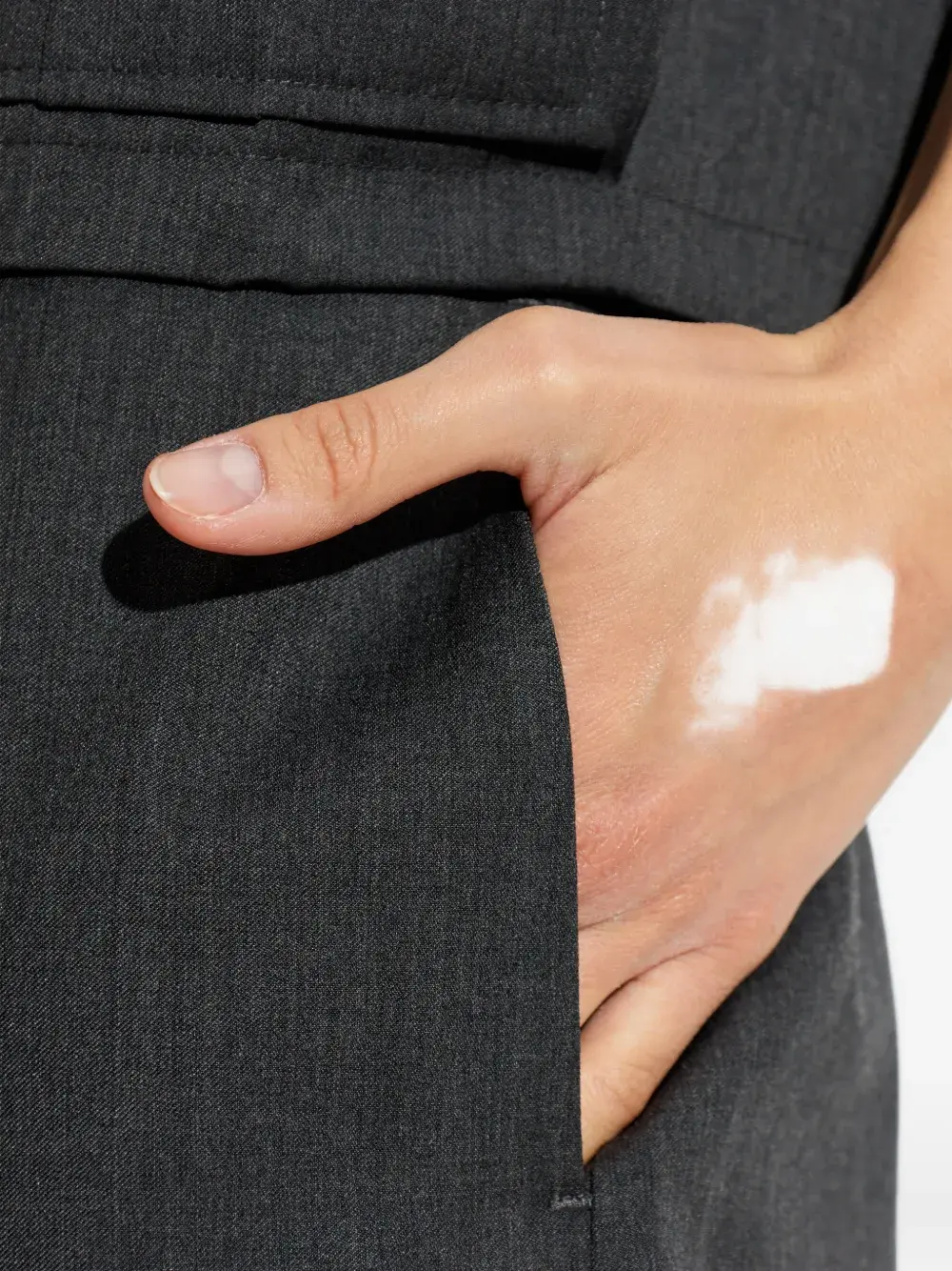 Темно-серый меланж, боковые карманы, широкие брючины, отделка швами, тональная строчка, шлевки для пояса