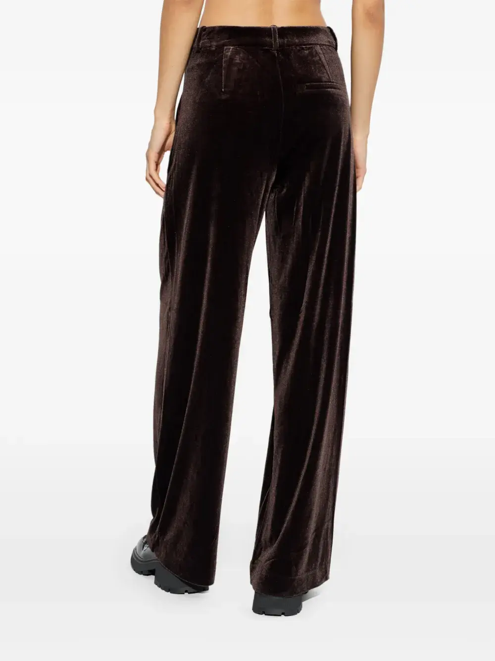 Темно-коричневая бархатная текстура, складки, шлевки для пояса, боковые карманы в швах, задний прорезной карман