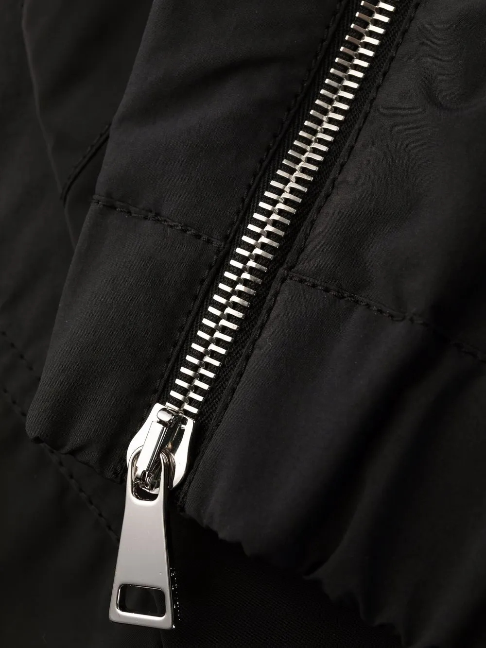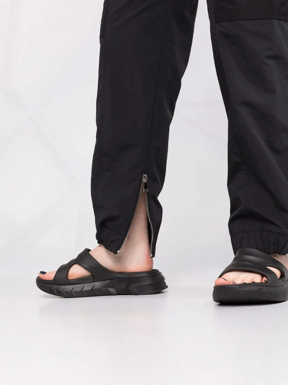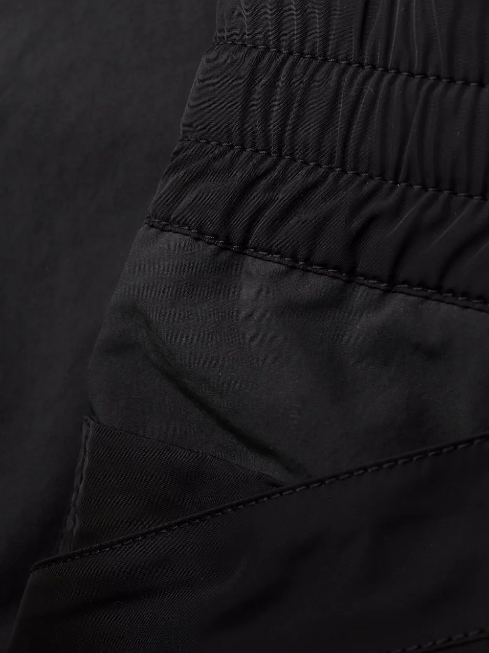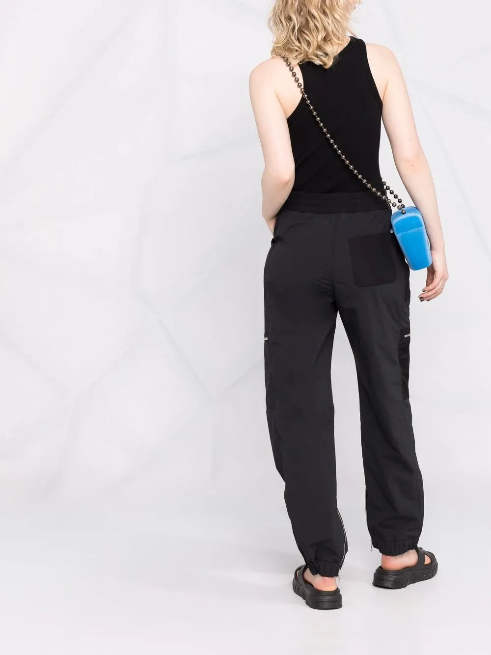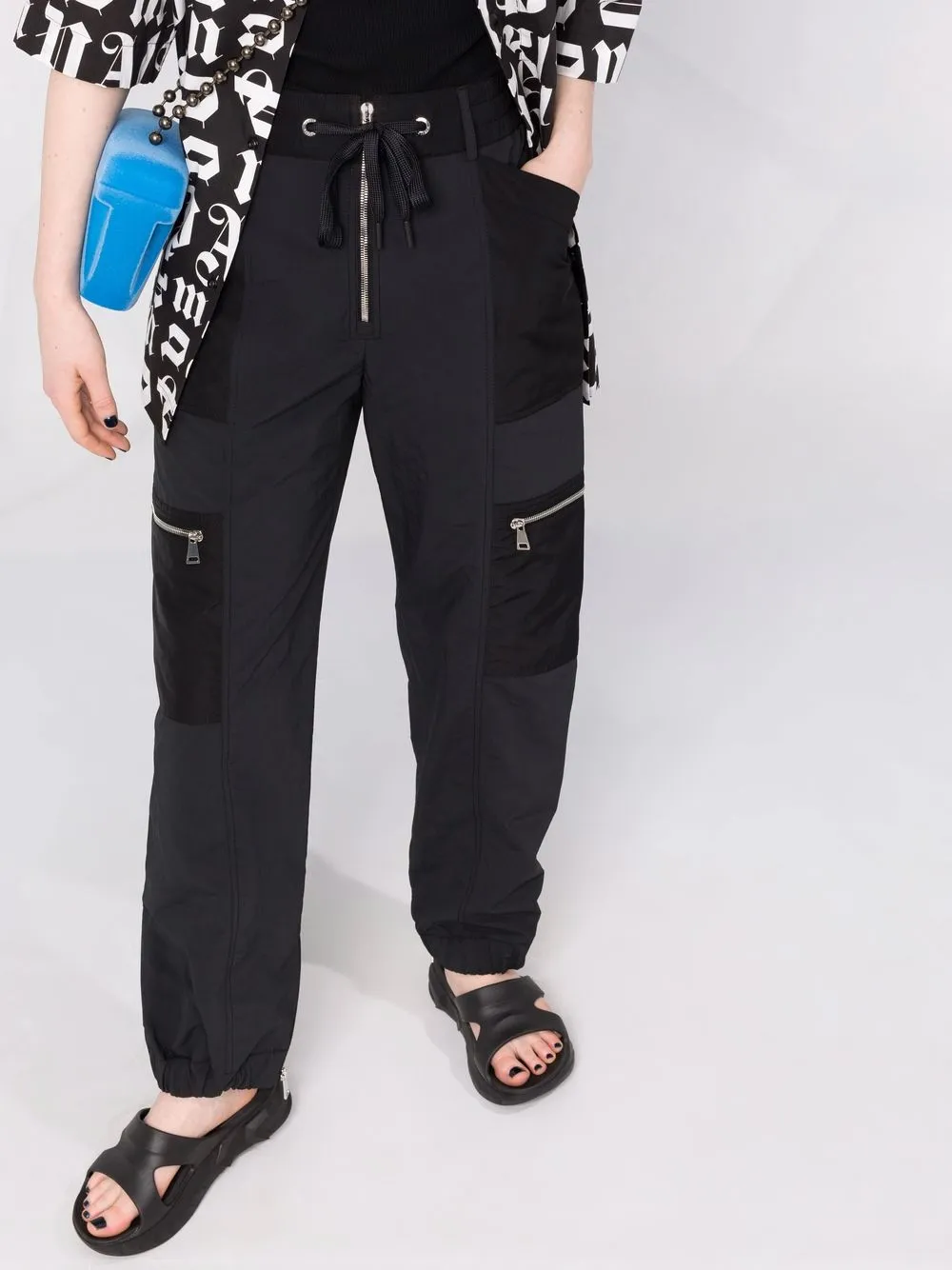 Застежка на шнурке, накладной карман сбоку, два кармана на молнии по бокам и эластичные манжеты.