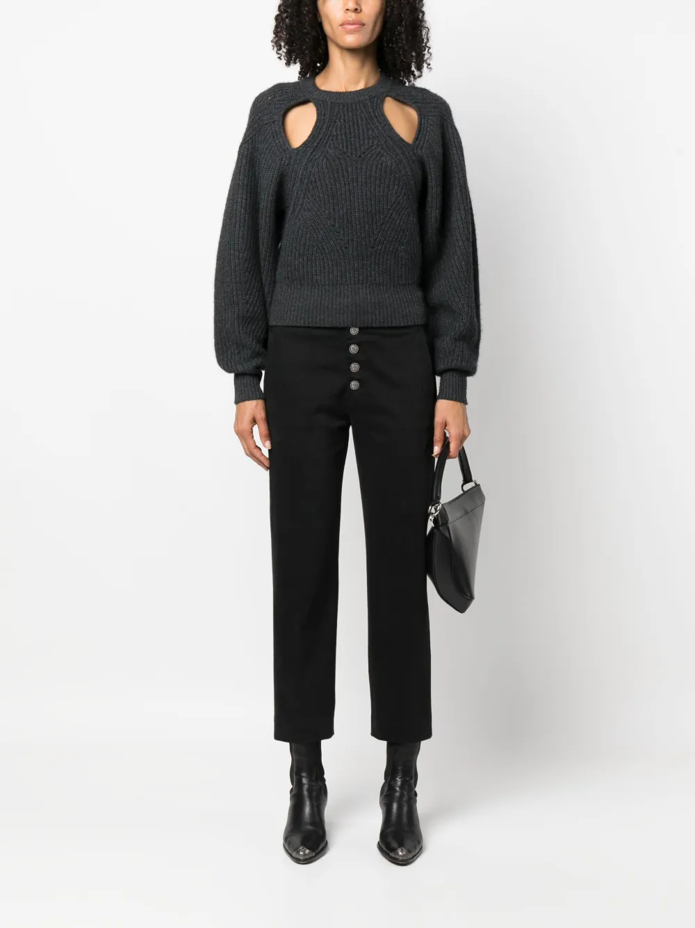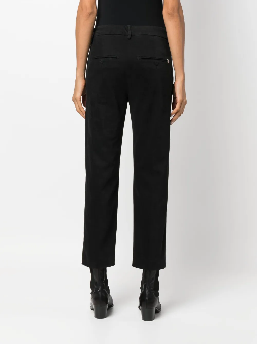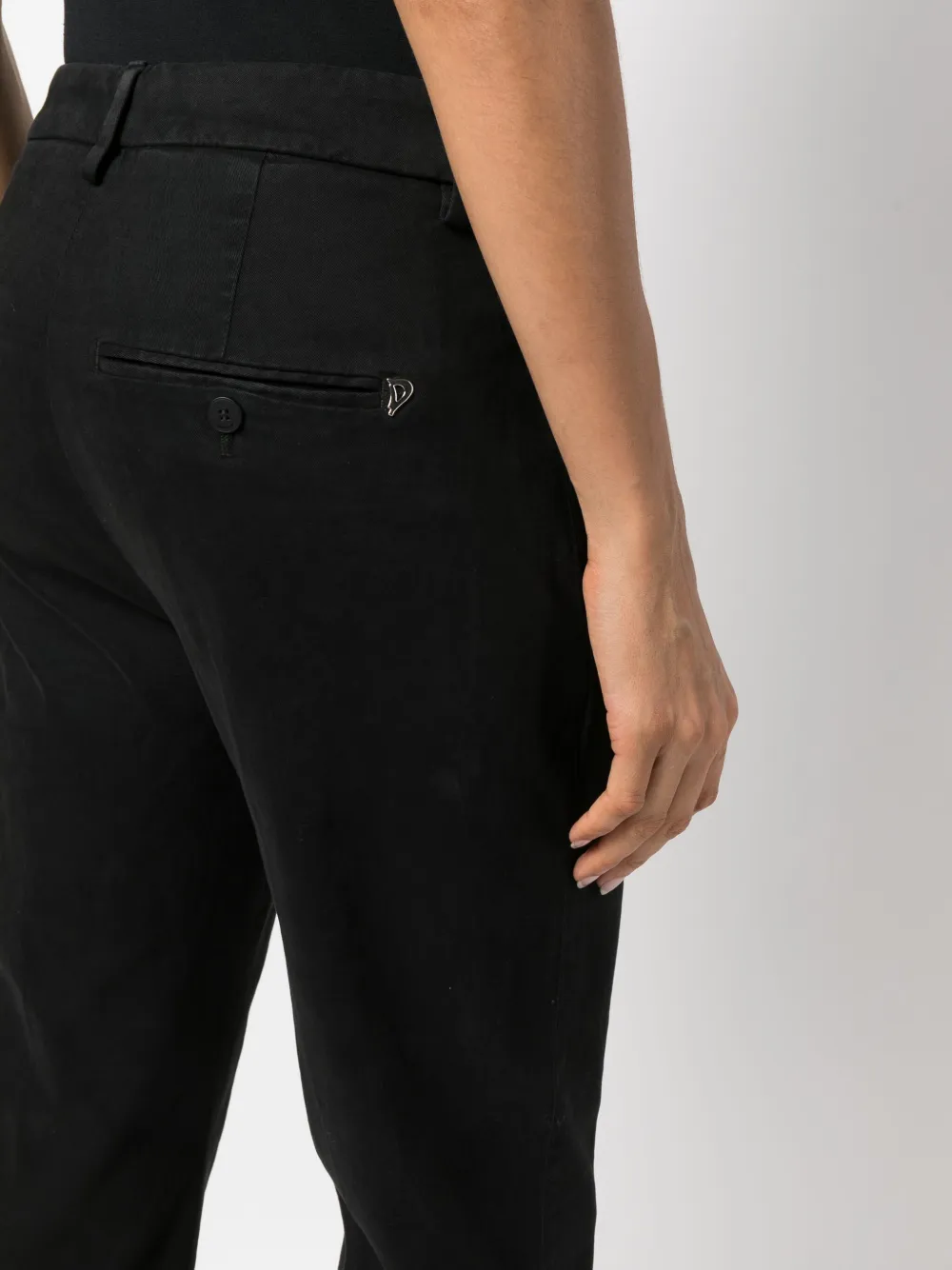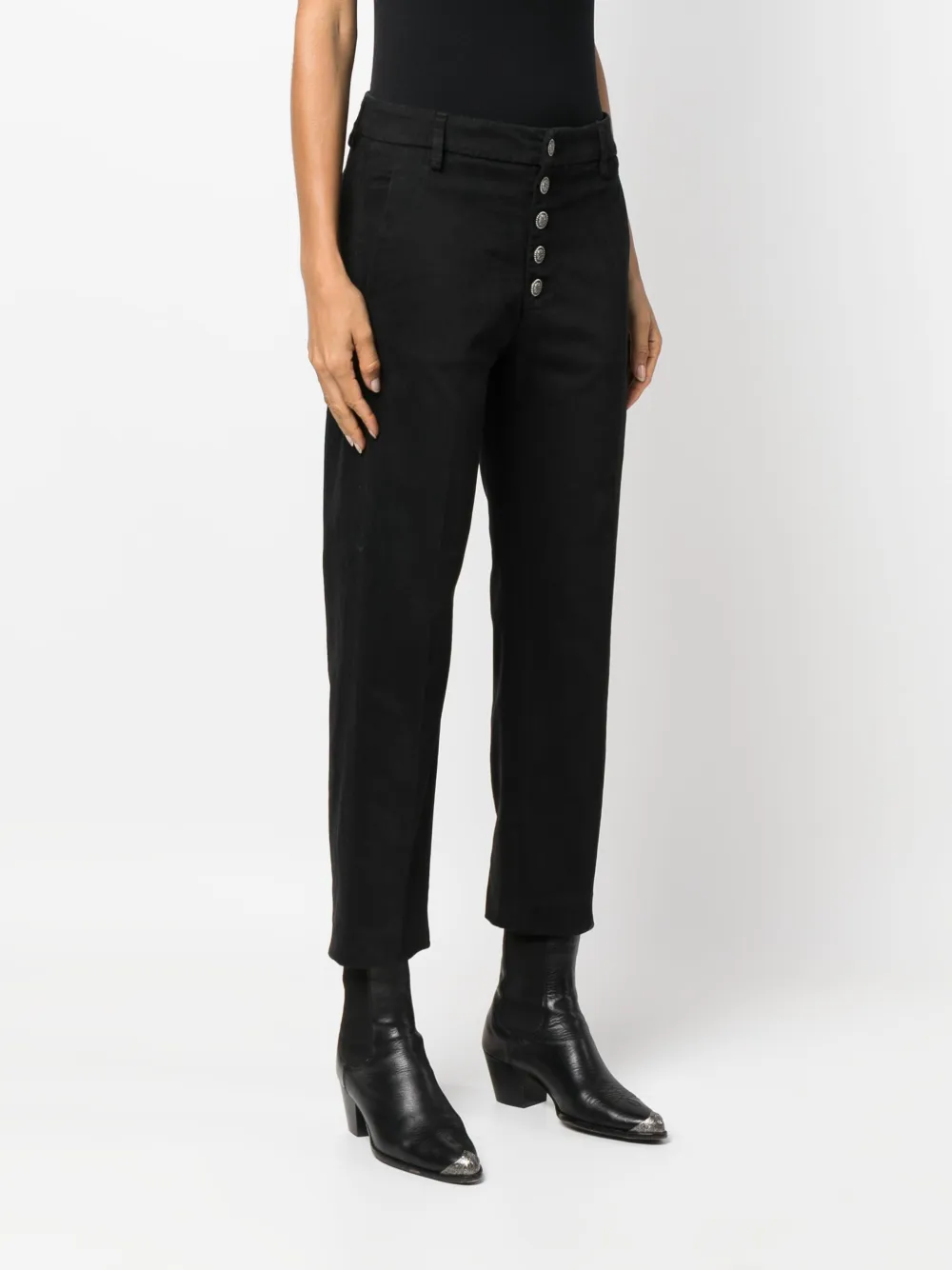 Черный, эластичный хлопок, застежка на пуговицах спереди, два вшитых кармана по бокам, два прорезных кармана сзади, петли для ремня, зауженный крой, укороченная длина и прямой подол.