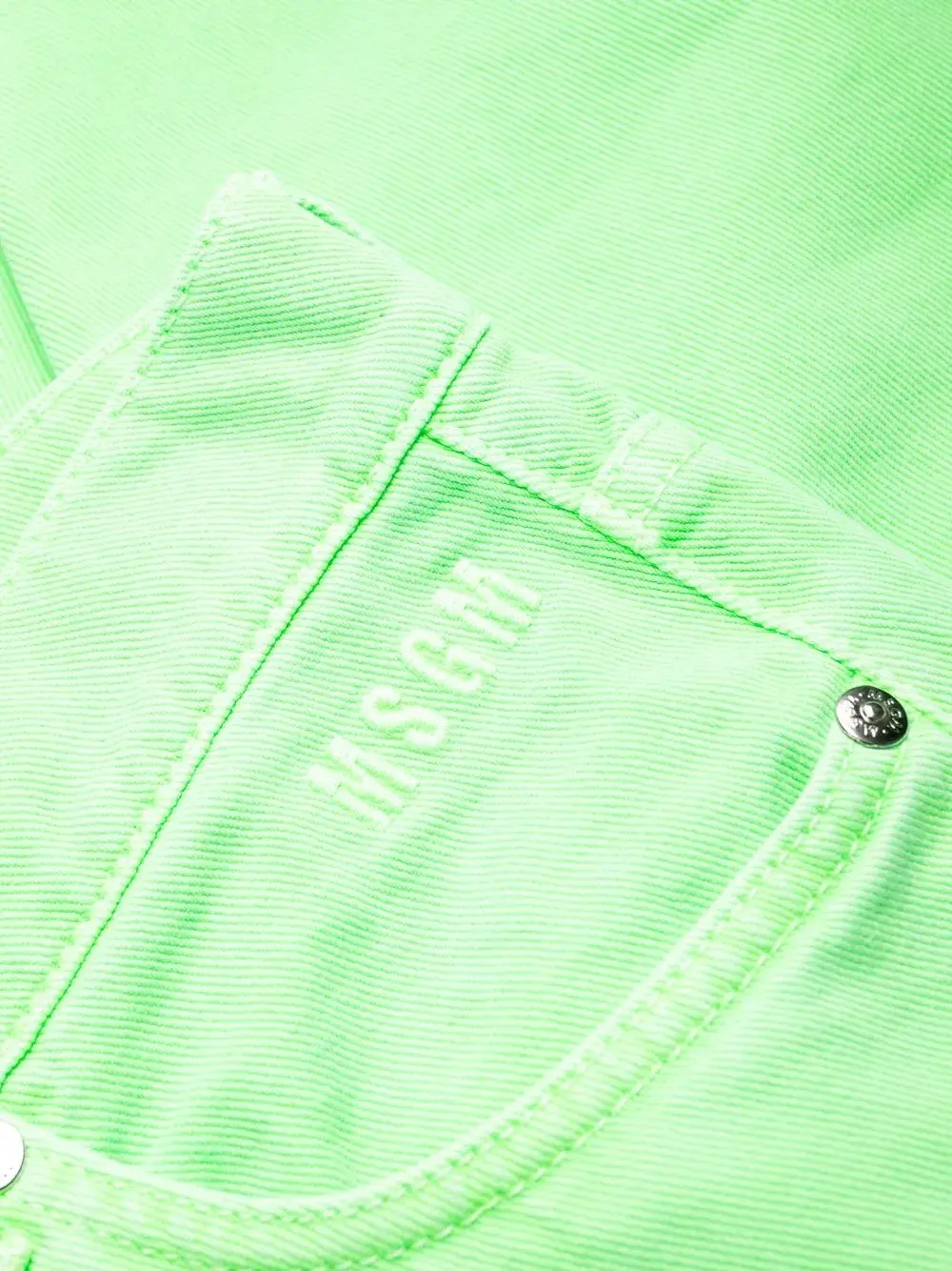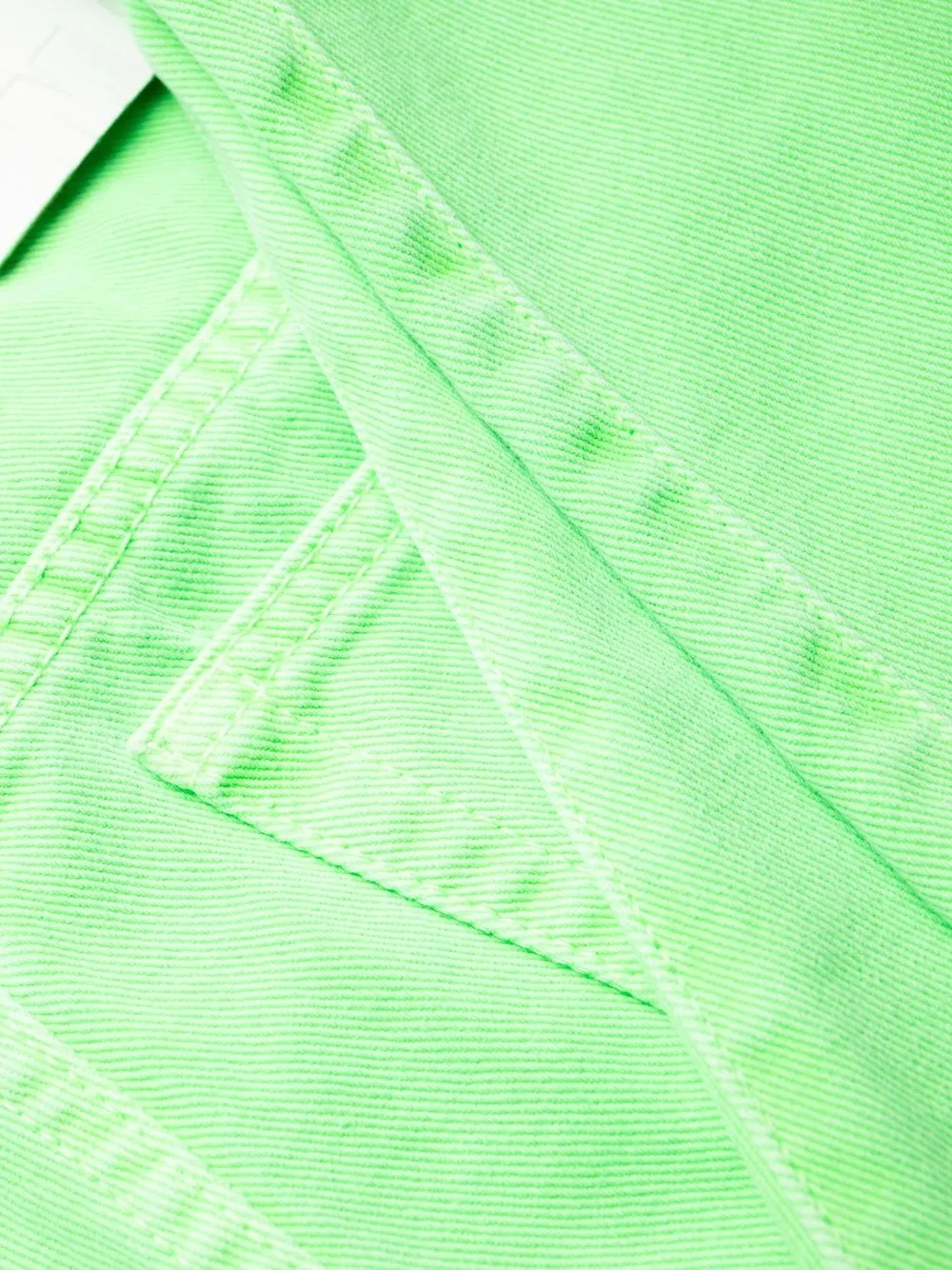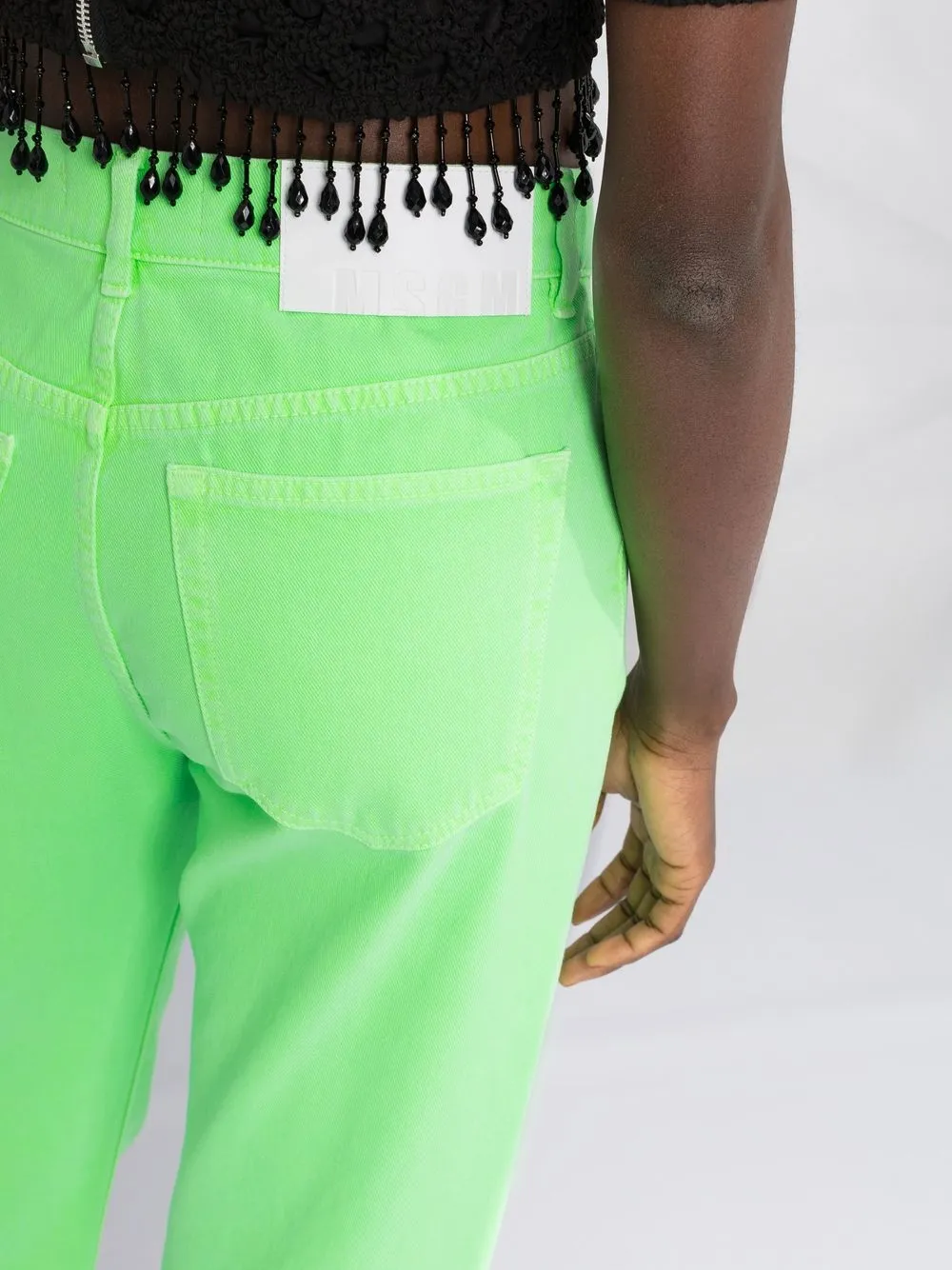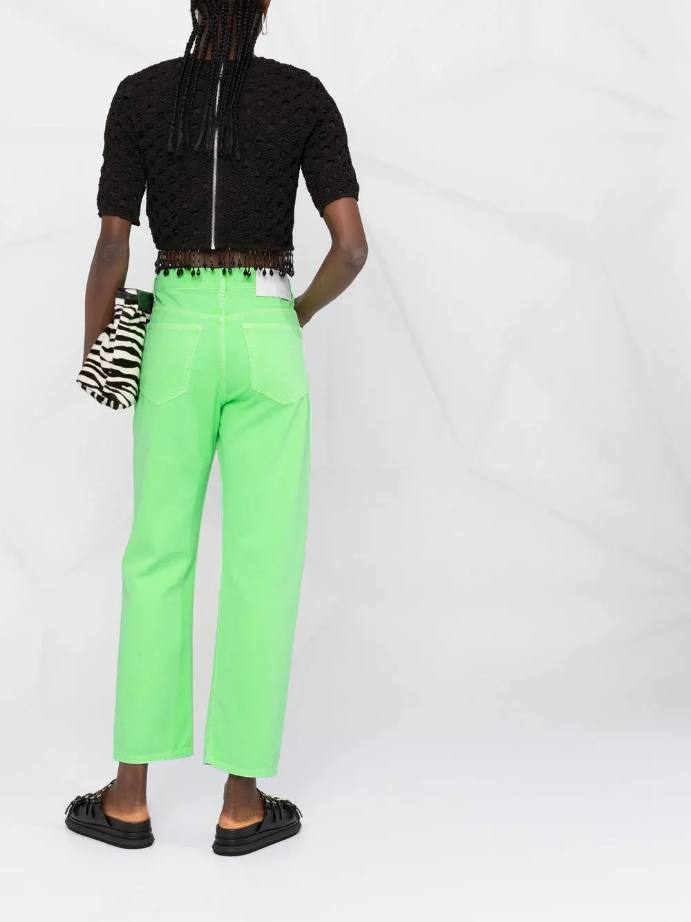 Завышенная талия, застежка на молнии и пуговице спереди, укороченная длина и классическая пятикарманная модель.