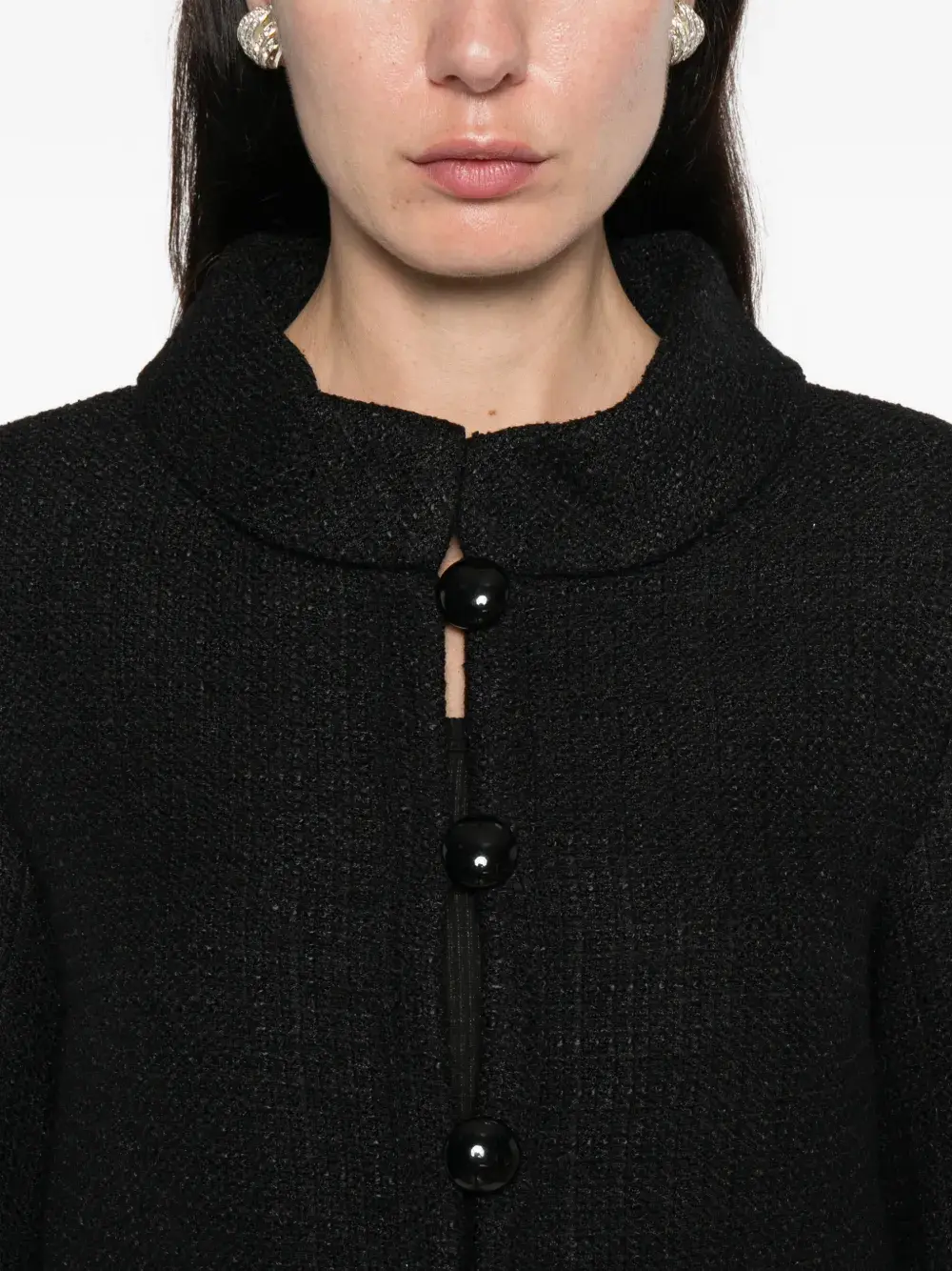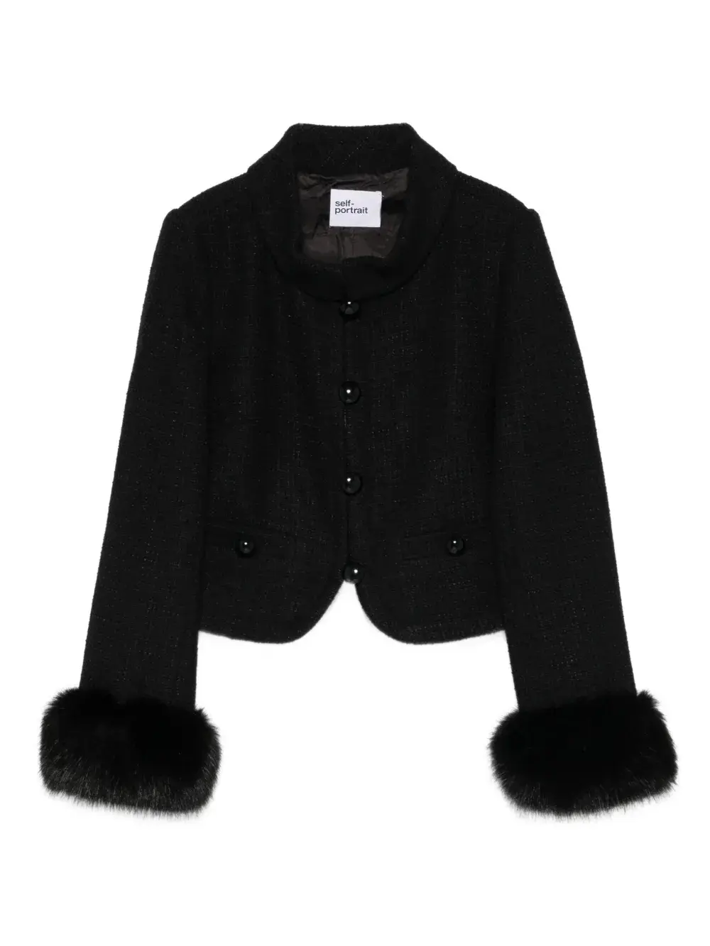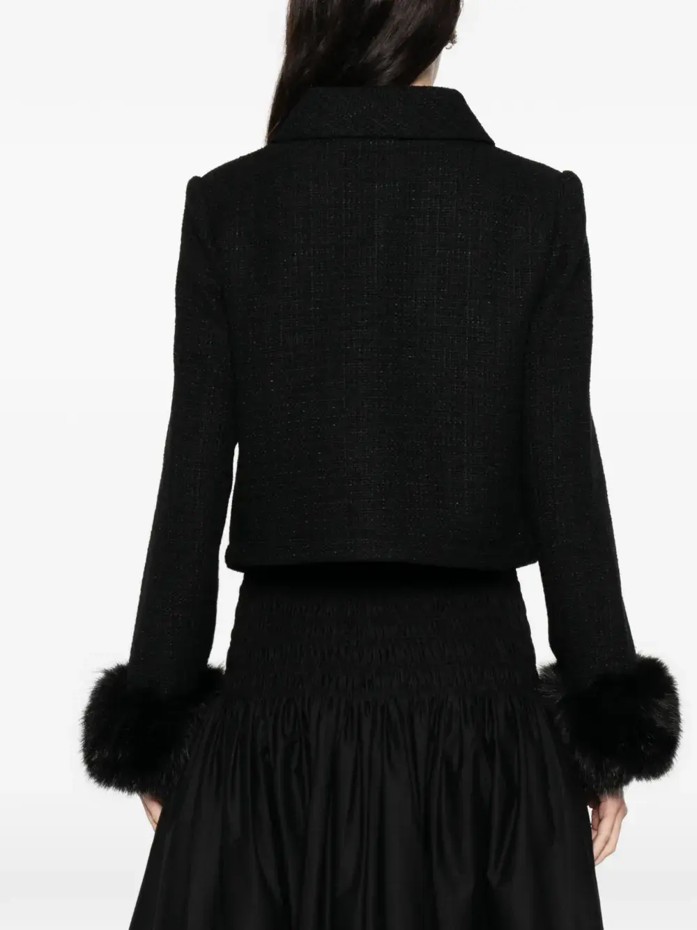 Черный твид с отделкой из искусственного меха, застежкой на пуговицы, воротником-стойкой и длинными рукавами