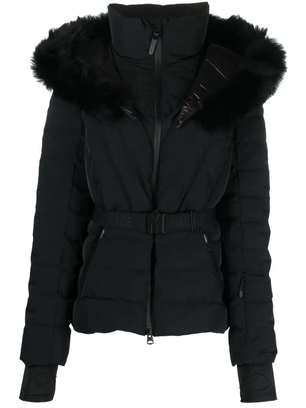 Черный, наполнитель из пуха и перьев, дутый материал, пряжка с логотипом, нашивка с логотипом сзади, ремень на талии, двусторонняя молния спереди, передние карманы на молнии, карман с молнией на рукаве и прямой подол.