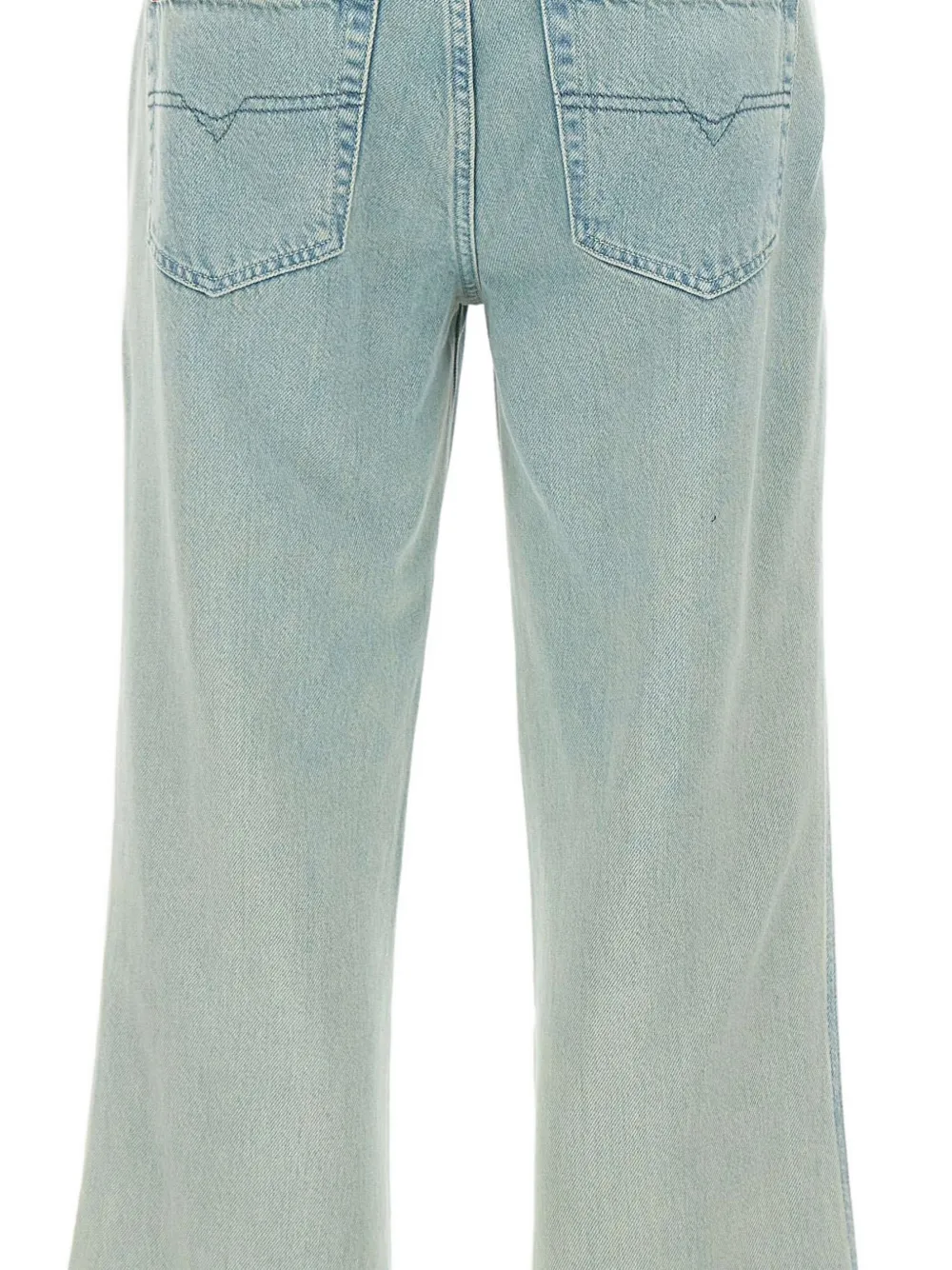 Светло-голубые джинсы с задними накладными карманами, скрытой застёжкой спереди и задней нашивкой с логотипом