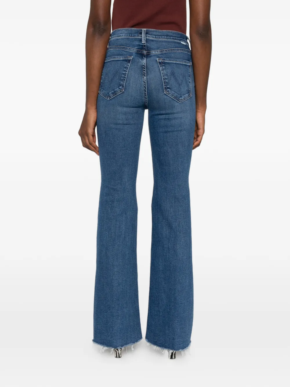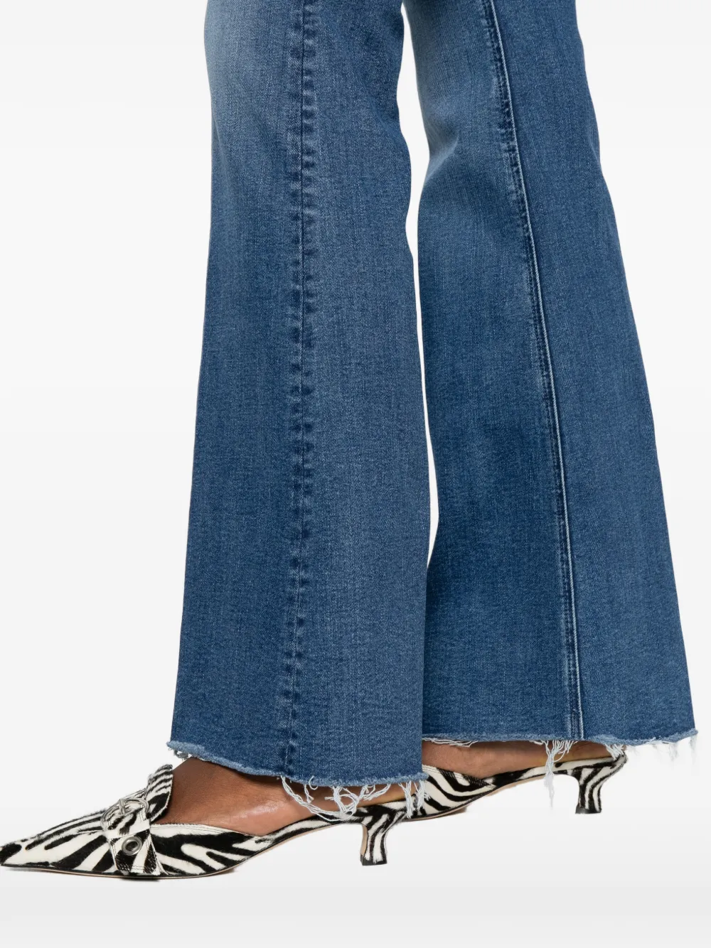 Синие джинсы с необработанным краем, пятью карманами, шлёвками для ремня, отделкой строчкой и расклешёнными штанинами
