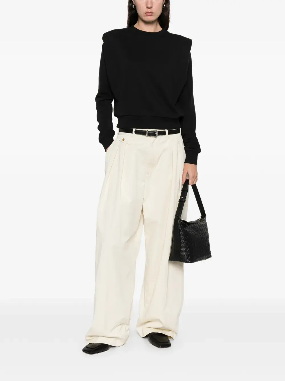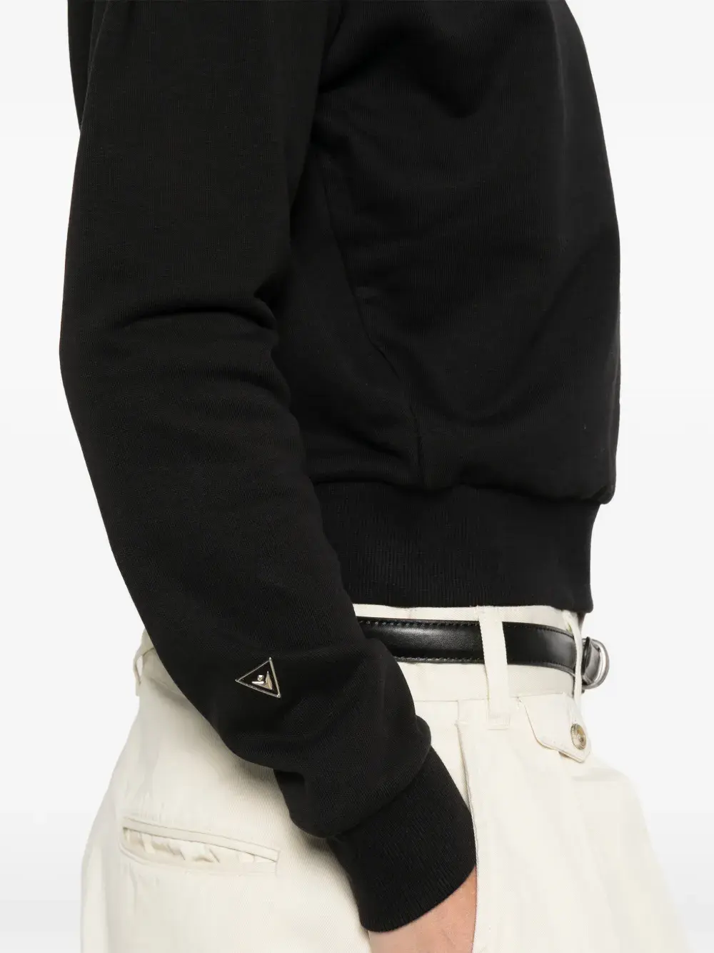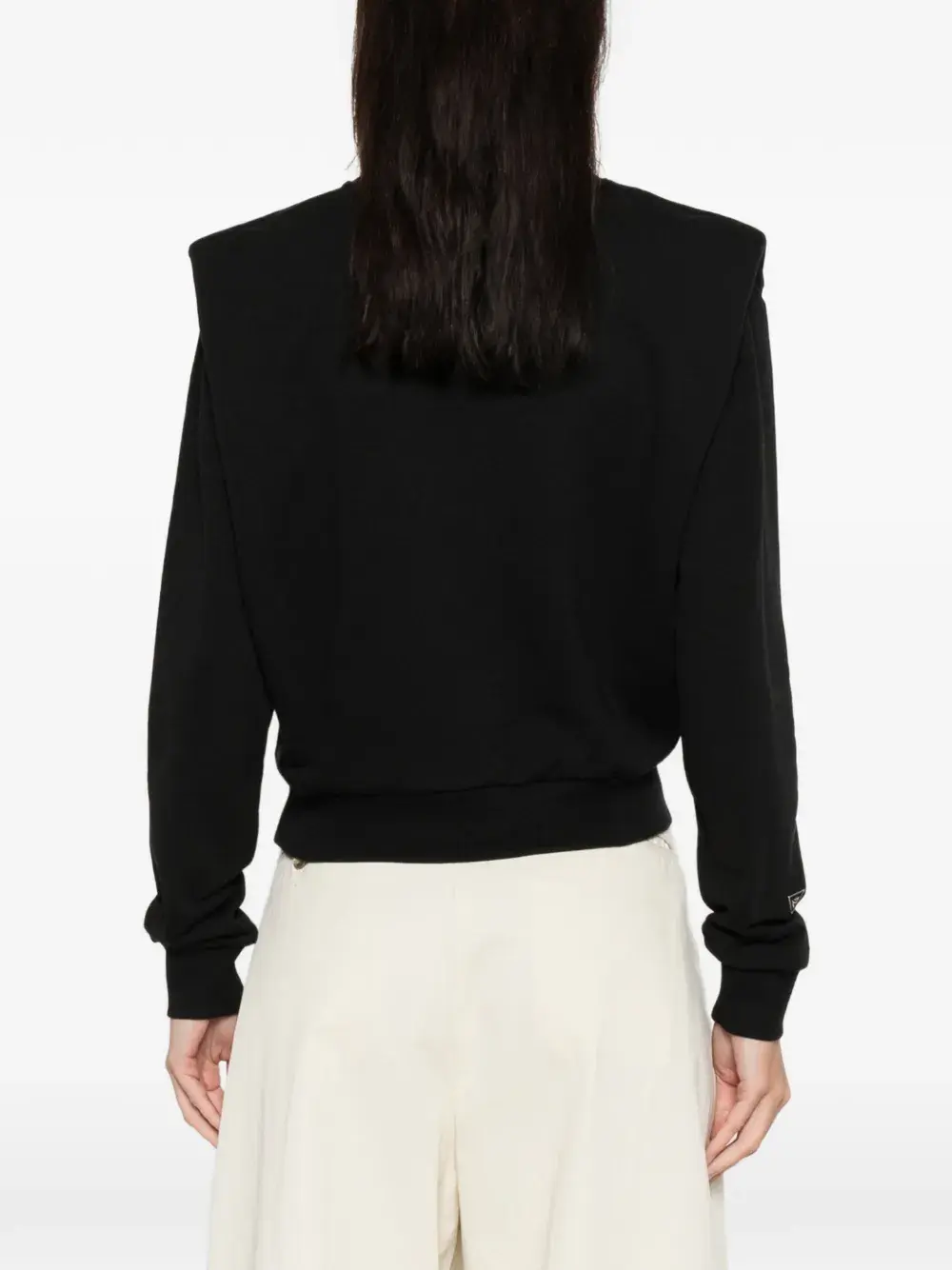 Черная хлопковая кофта с подплечниками, длинными рукавами, логотипом, круглым вырезом и трикотажными манжетами
