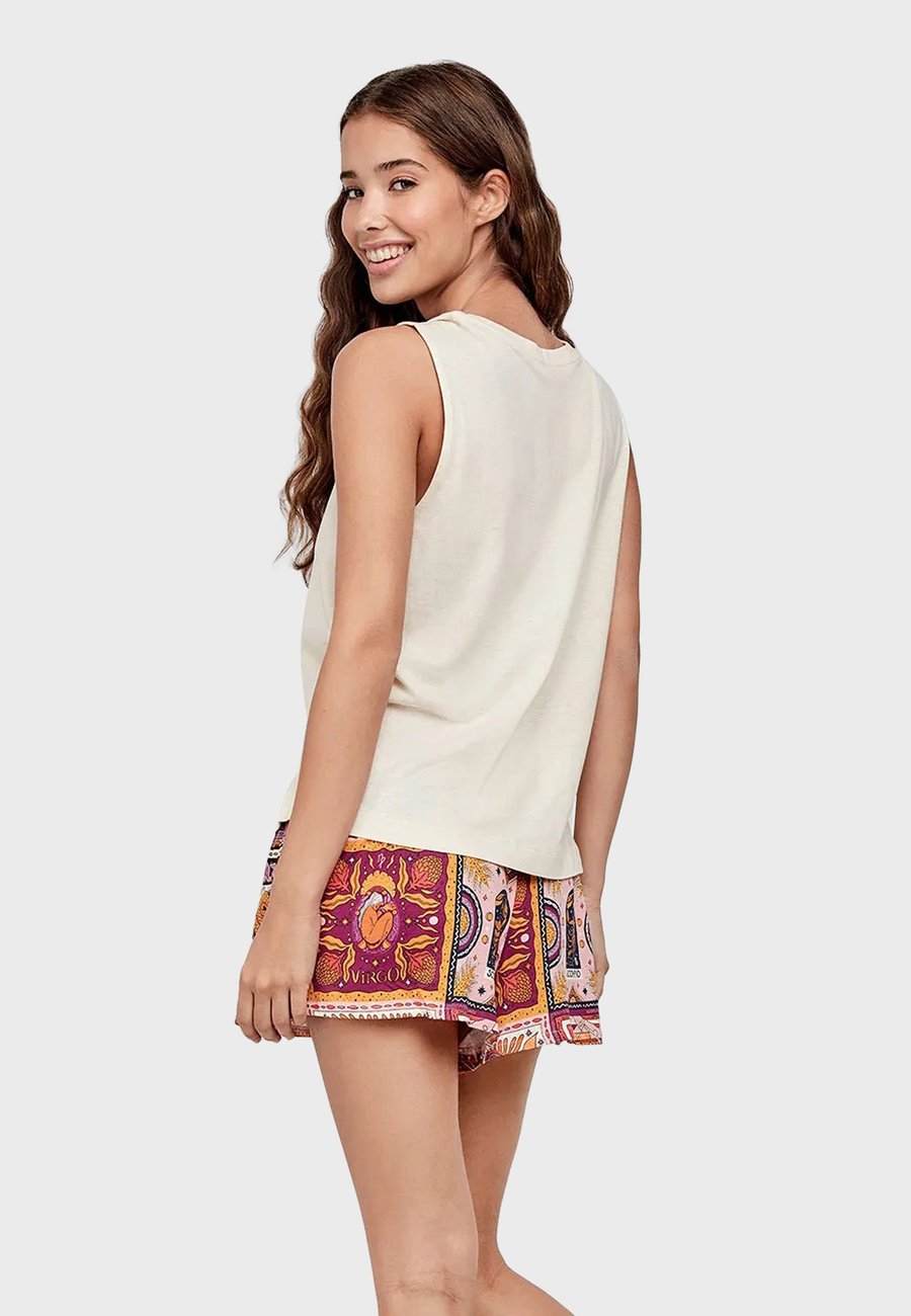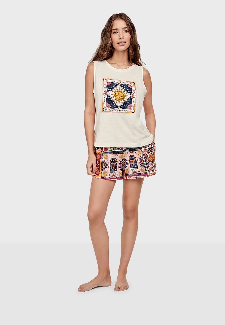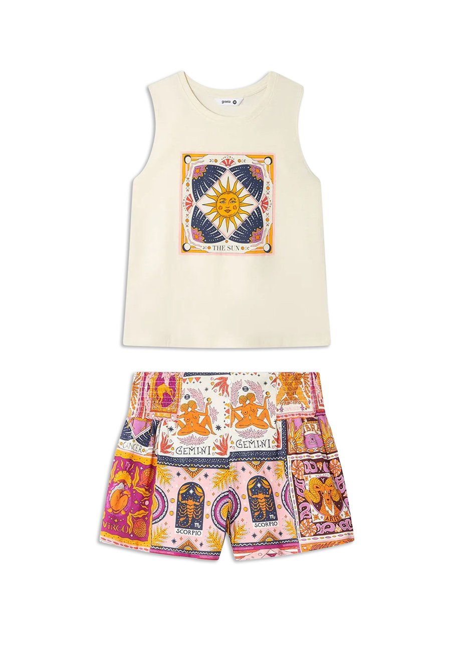 Пижамный комплект, состоящий из майки на тонких бретелях, украшенной в центре мотивом зодиака. Соответствующие шорты из контрастной ткани с принтом обеспечивают удобную посадку благодаря эластичному поясу. Идеально сочетает стиль и комфорт. Высота посадки: высокаяМатериал и уход