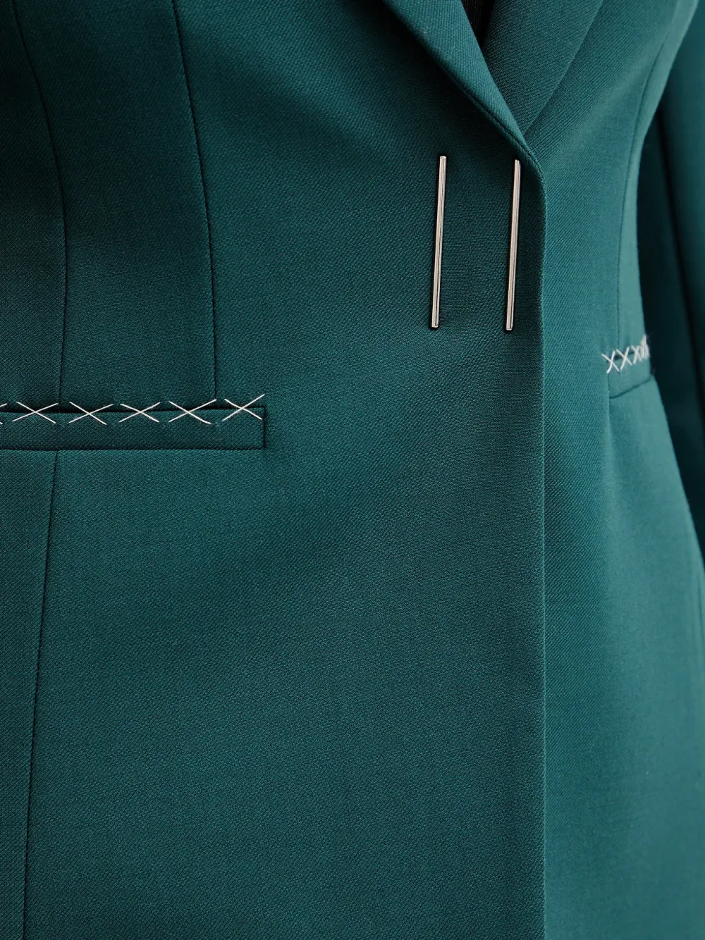 Металлическая фурнитура, декоративная строчка крестиком, отложной воротник, длинные рукава