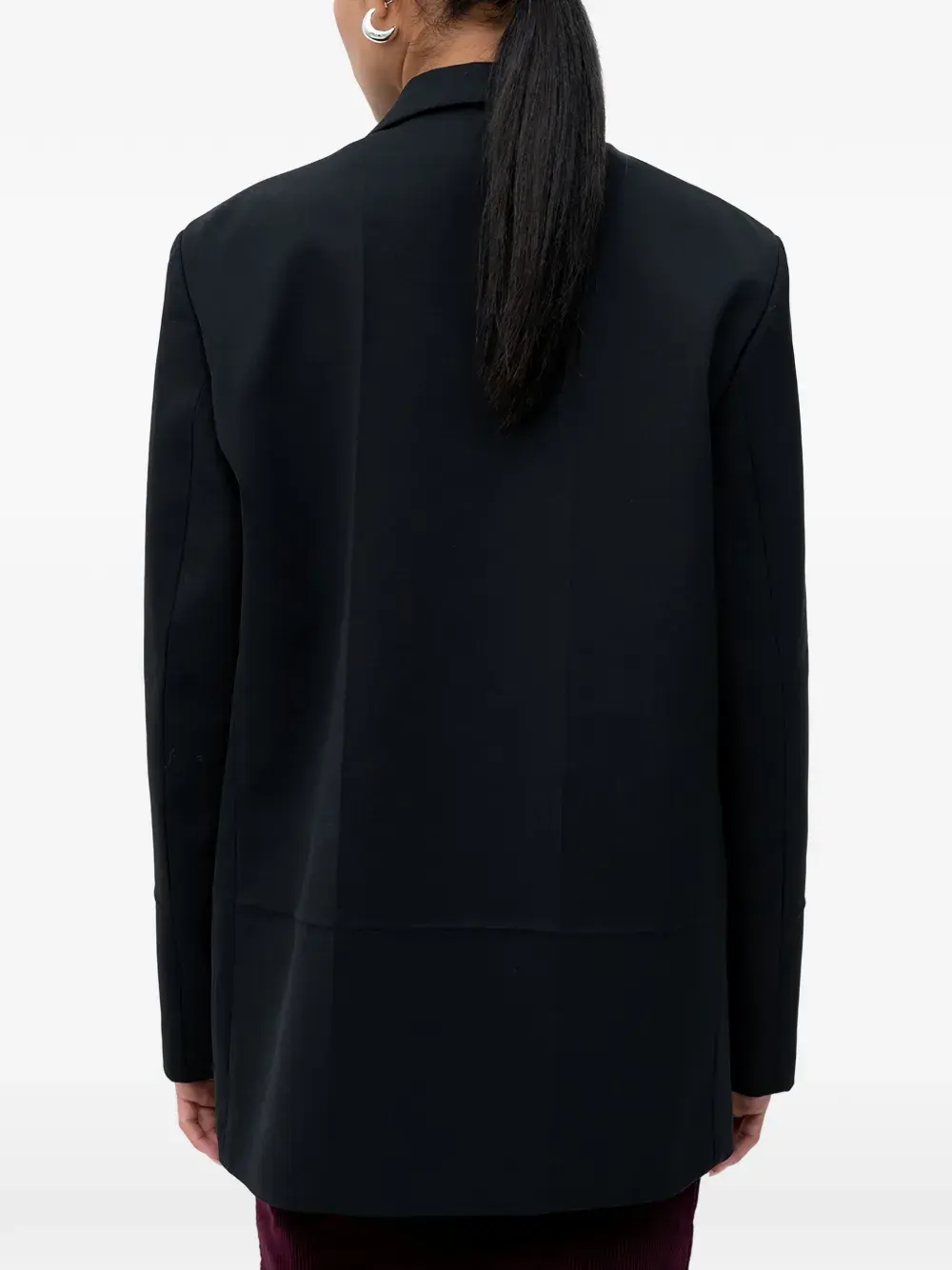 Черный пиджак с лацканами с вырезом, клапанными карманами, длинными рукавами, застежкой на пуговицы и прямым подолом