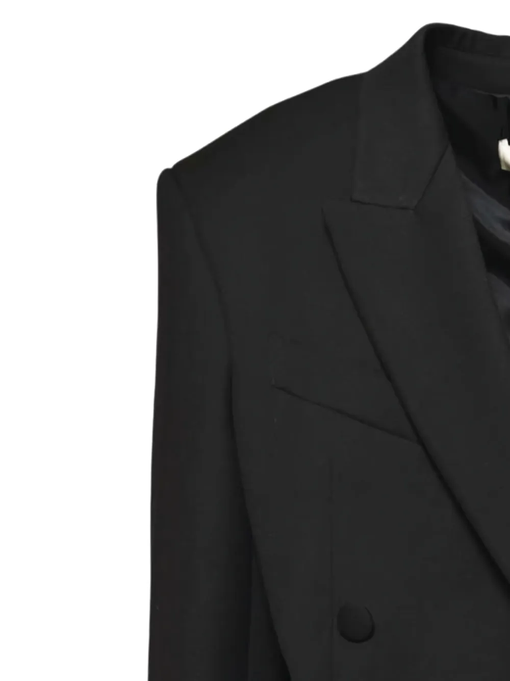 Черный двубортный пиджак с застежкой на пуговицы, острыми лацканами и длинными рукавами