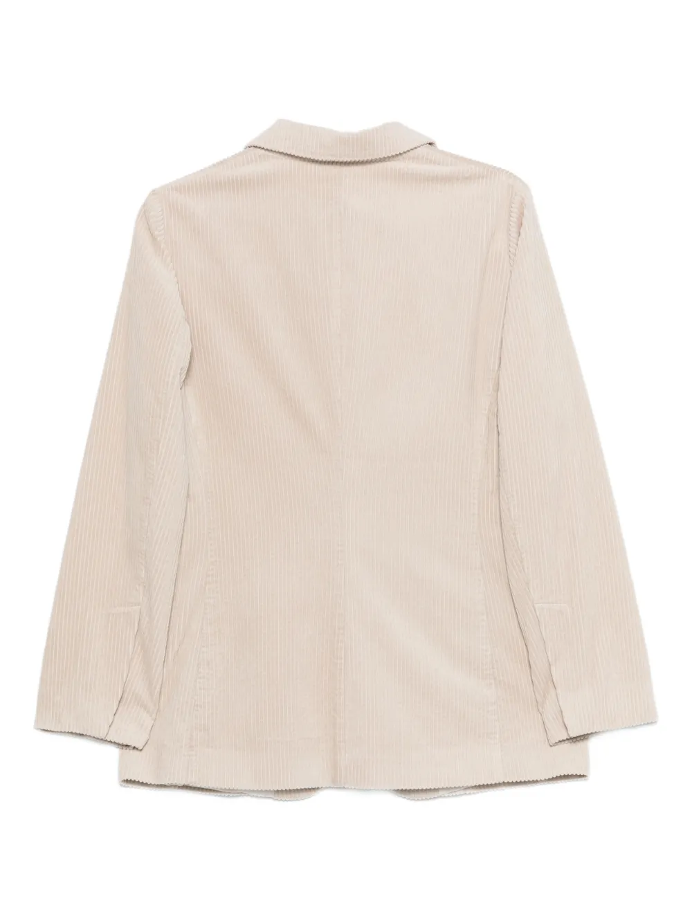 Бежевый вельвет, лацканы с вырезом, два передних кармана, застежка на пуговицы, нагрудный карман