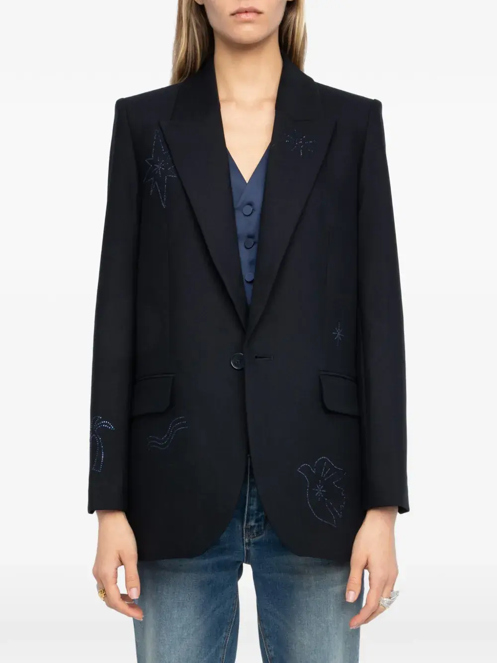 Темно-синий цвет, украшение стразами, графический мотив, лацканы с вырезом, застежка на одну пуговицу, карманы с клапанами