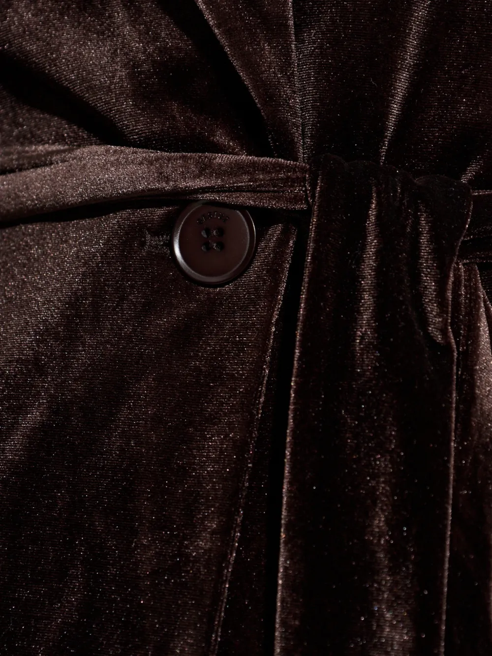 Шоколадно-коричневая отделка из бархата, лацканы с вырезом, застёжка на пуговицы, прорезные карманы, пояс-завязка