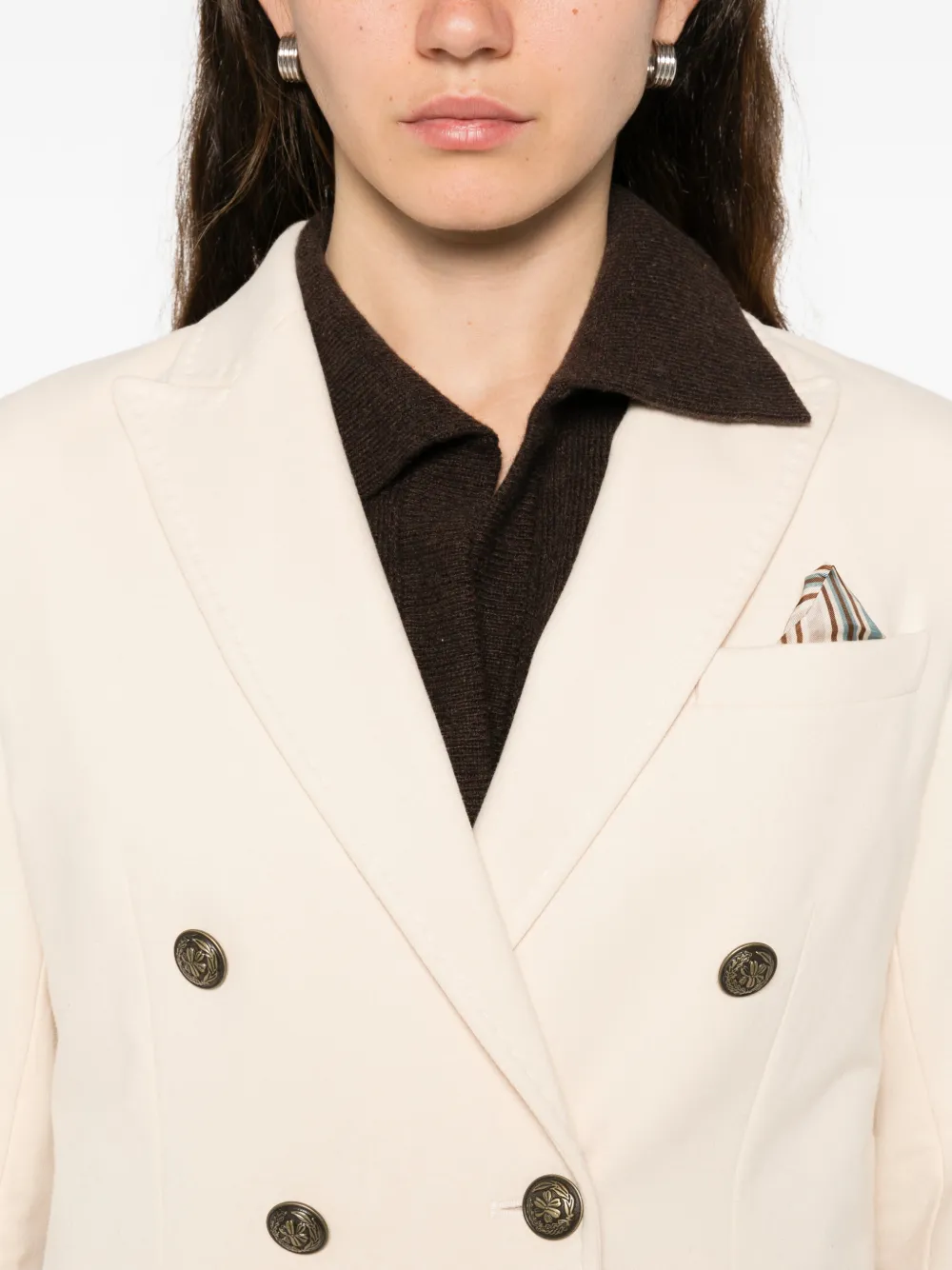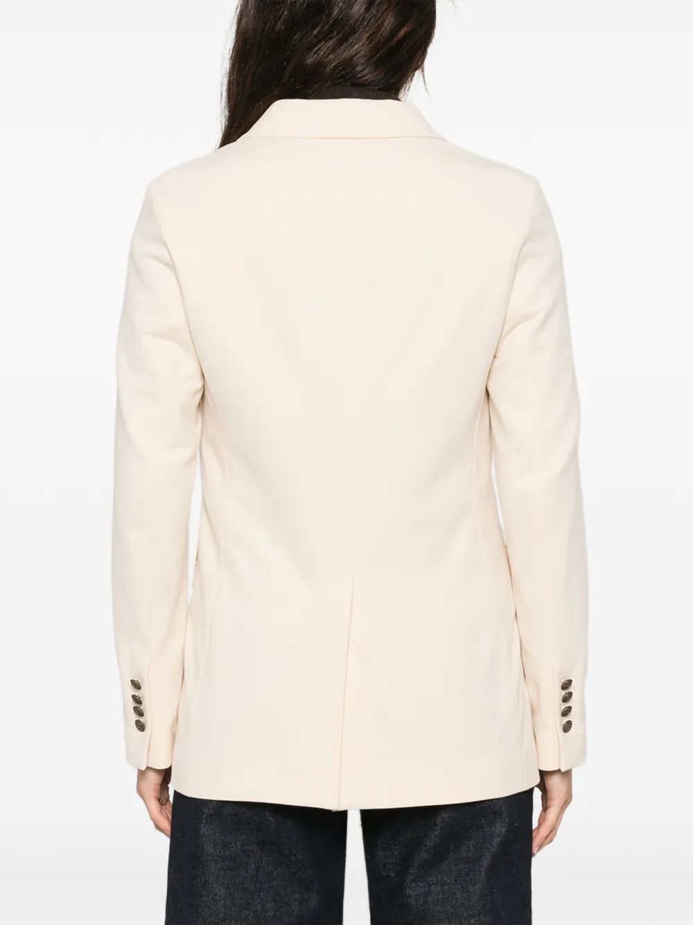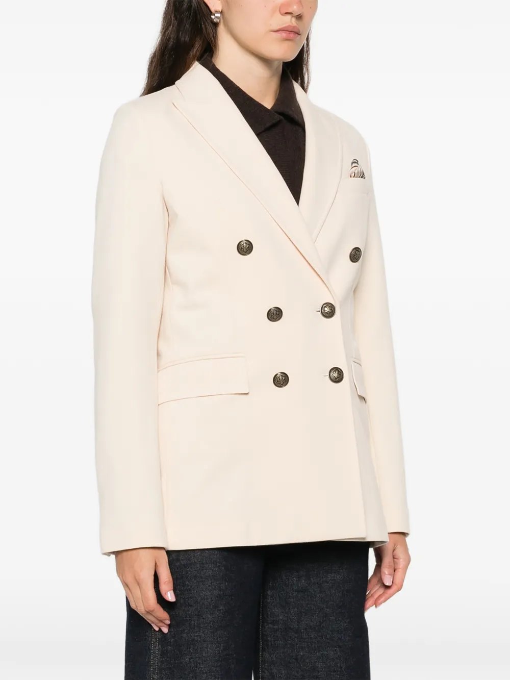 Кремовый двубортный пиджак на пуговицах с передними карманами и длинными рукавами