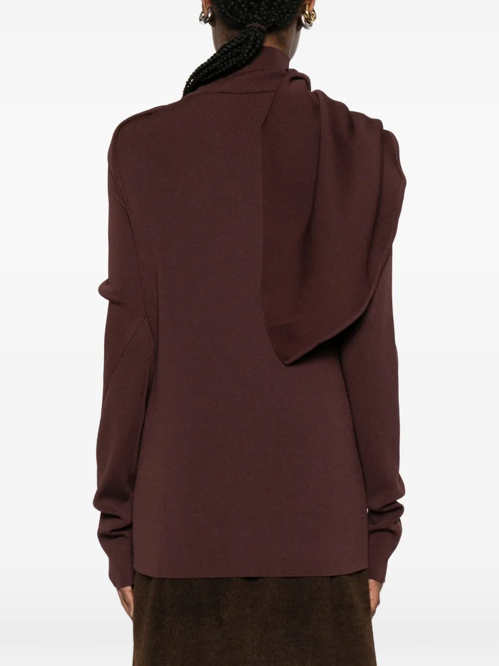 Бордовый топ с высоким воротом, длинными рукавами и драпированной вставкой