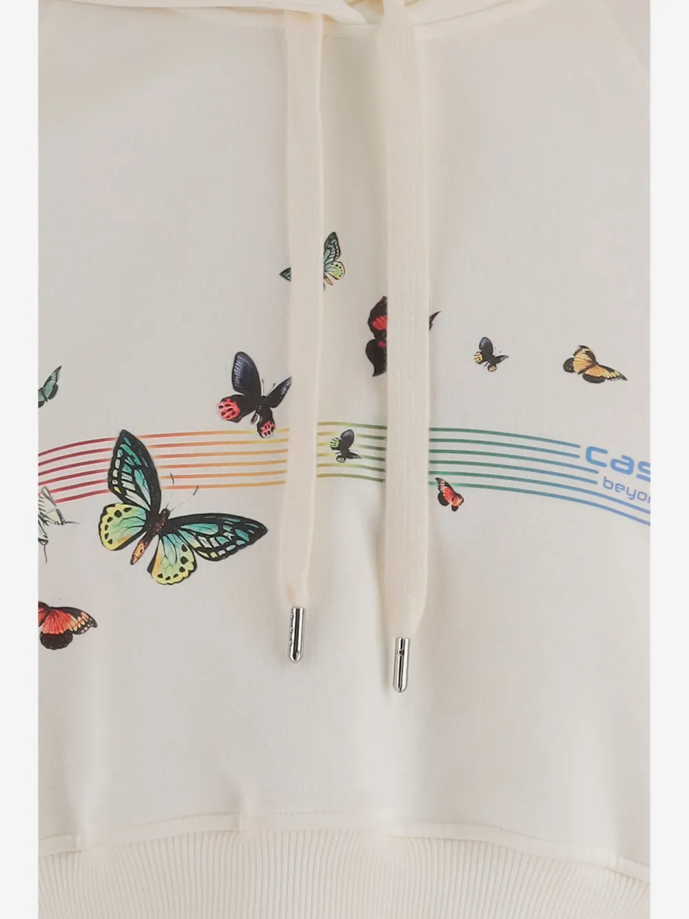 Кремово-белое худи с принтом бабочек, кулиской, длинными рукавами и ребристыми краями