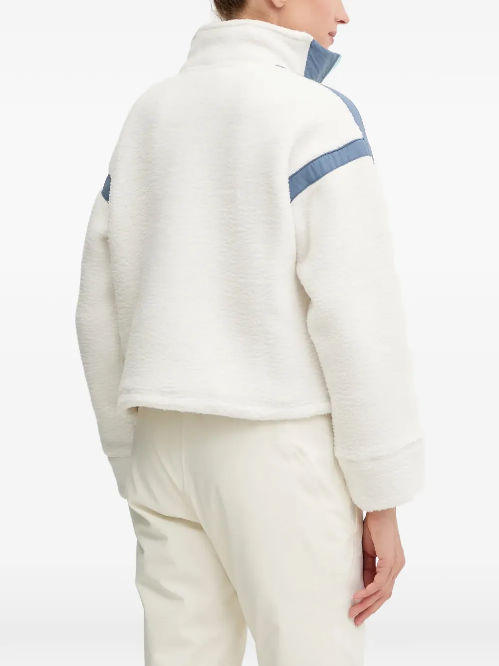 Белый верх с высоким воротом, молнией, полосками, логотипом и длинными рукавами
