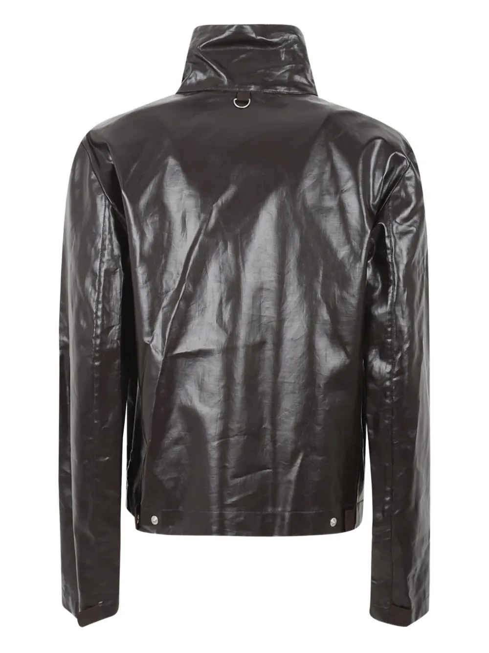 Коричневый свитер с высоким воротом, застежкой на пуговицы, накладными карманами, длинными рукавами и фурнитурой серебристого оттенка