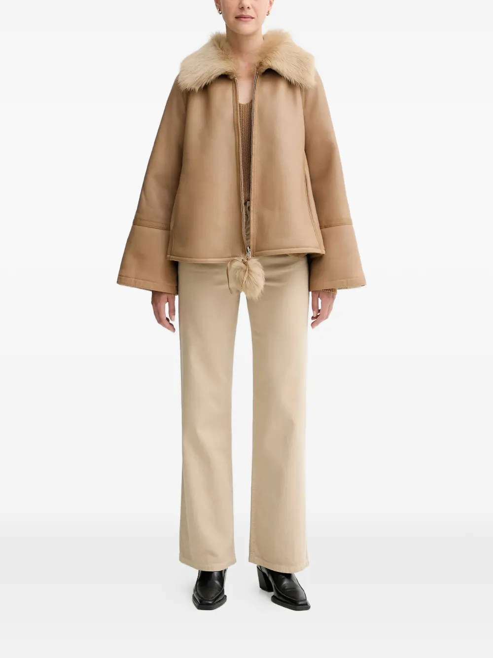 Бежевый шевролинговый материал, застежка на молнию, круглая форма, объемные детали, длинные рукава, конструкция с панелями