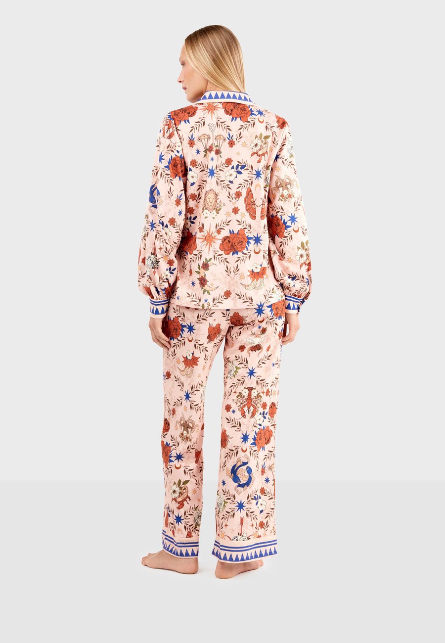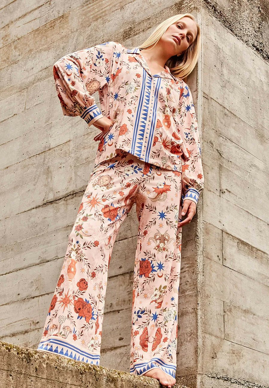 Элегантный пижамный комплект, состоящий из блузки с длинными рукавами и слегка пышными рукавами, украшенными изящными складками на манжетах, и струящихся брюк-палаццо. Принт теплых тонов вдохновлен знаками зодиака, цветами и звездами, создавая одновременно изысканный и поэтичный образ. Посадка: НормальнаяМатериал и уход