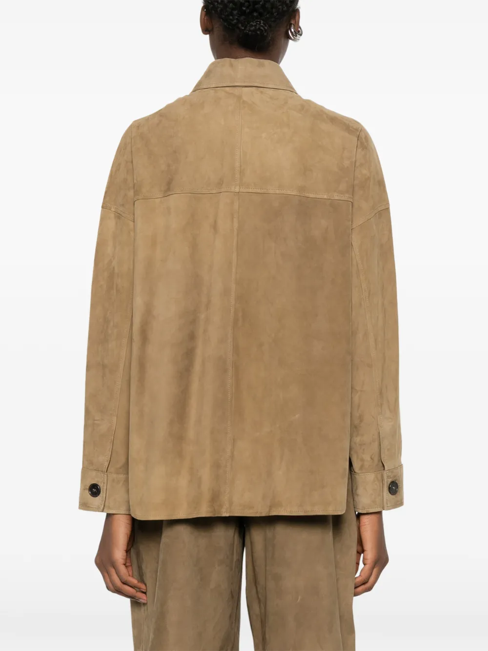 Оливково-зеленая замшевая кожа, застежка на пуговицы, накладные карманы